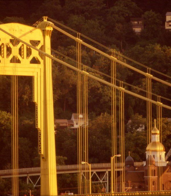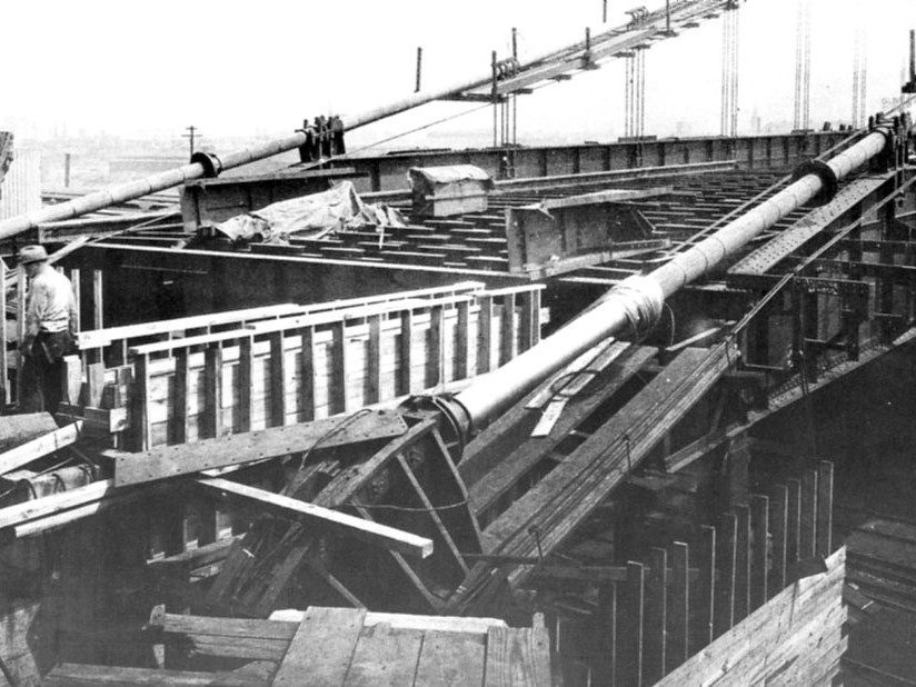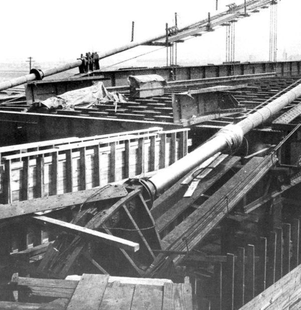 Completed in 1932 by American Bridge, the 10th Street Bridge is a 1,275′ suspension bridge with a 725′ main span, stiffening girder, and parallel wire strand main cables. American Bridge served as the prime contractor, erecting all superstructure.