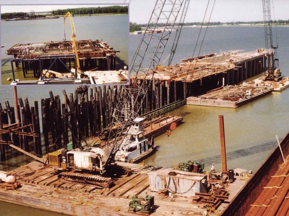 Completed in 1999 by Johnson Bros. Corporation, Acadian Bulk Terminal – Dock & Material Handling Facility project consisted of the construction of a dock measuring 812 feet long by 68 feet wide, with mooring dolphins extending 100 feet on each end. A bridge 427 foot in length provided access from the levee to the dock. The bridge and dock required 851 pilings ranging from 18-inch square concrete pile to 30-inch steel pipe pile, 190 feet long. During construction in the spring of 1997, the Mississippi River, just north of New Orleans, had near record flows. The project took a major setback on March 21, 1997 when a tow consisting of 19 loaded barges rammed the uncompleted dock and bridge. Over 42,000 linear feet of piling had to be re-driven and five spans of the bridge had to be demolished and replaced. The initial fast-track schedule had to be accelerated to comply with the original deadline of December 1, 1997, at which time the terminal had to be ready to receive material. In order to meet the deadline, the owner actually took work from other contractors and assigned it to Johnson Bros. Corporation.