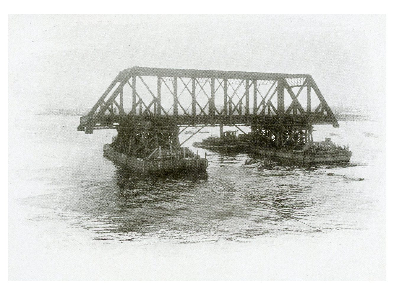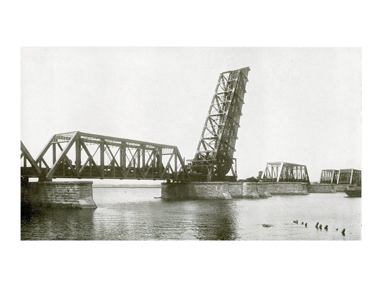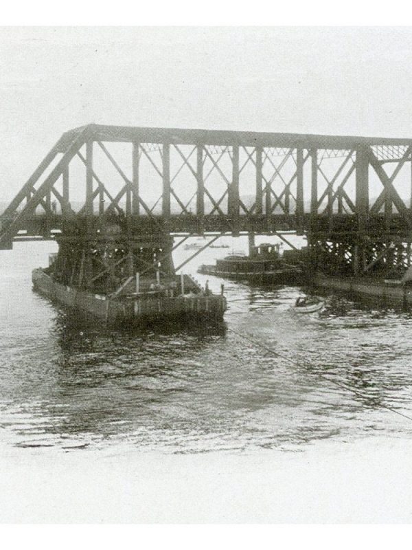 Consisting of seven double-track pin-connected spans, each 183 ft 0-in c-c; one double-track deck plate-girder span, 67 ft 0-in c-c; one double-track Scherzer type of bascule span 158 ft 3-in. Weight 6,181 tons. The old single-track bridge was no longer able to handle the train frequency and weights that the New Haven wished to run. Construction of the new bridge began in May 1905, and the substructure was completed in April 1906. The bridge was built with two-track spans, with the abutments long enough for a second set of spans should quadruple-tracking of the line take place. The new bridge opened on August 6, 1907.