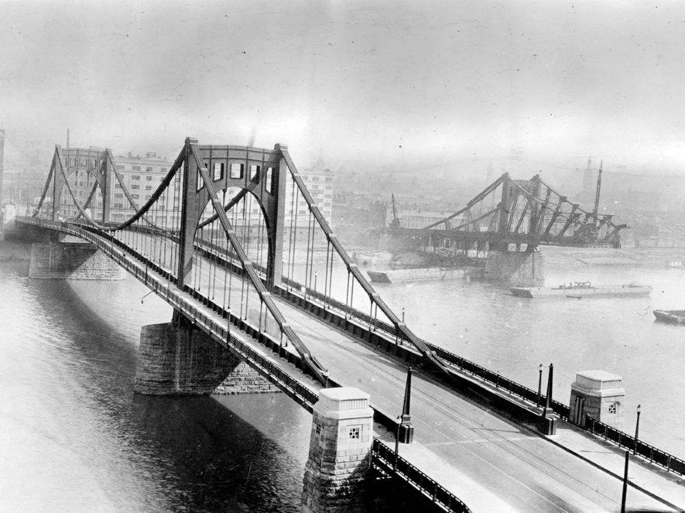 Completed in 1926 by American Bridge, the Andy Warhol Bridge (Seventh Street Bridge) project consisted of a self-anchored, eye-bar suspension bridge—one of the nearly identical “Three Sisters” bridges. The structure features 14″ eye-bars with 4″ eye-bar suspenders and triple web plate girders that handle both bending and compression. All three bridges were fabricated and erected by American Bridge, which used an innovative cantilever method by temporarily converting the system into a truss, eliminating the need for falsework in the river.