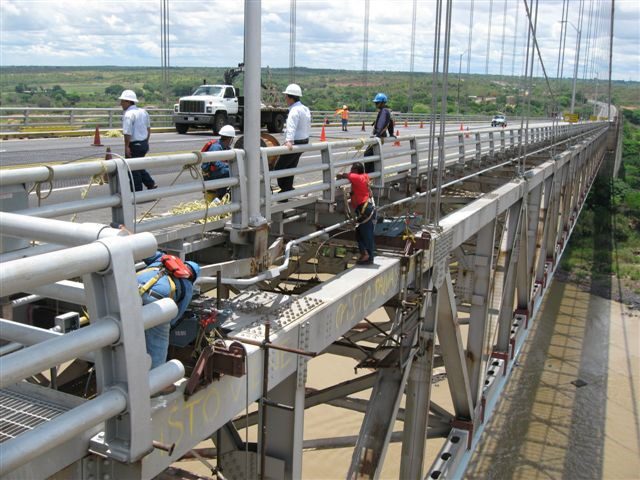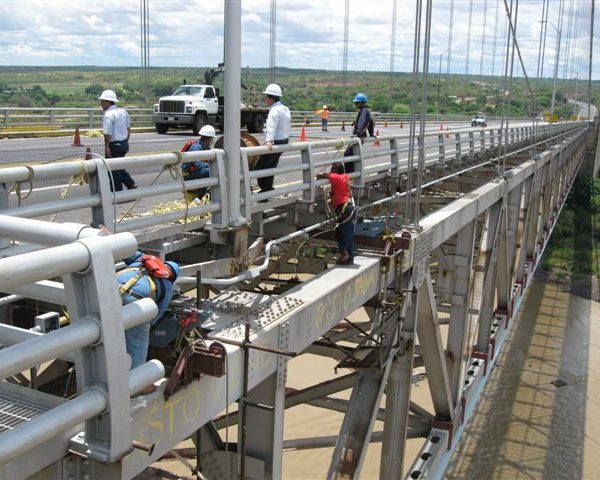 Completed in 2008 by American Bridge, the Angostura Bridge Engineering Services project involved the rehabilitation of the 2,336′ suspension bridge. This included truss rehab, main cable inspection and repair, hanger rope replacement, and grid deck repair. American Bridge designed and provided temporary work platforms, cable carts, and specialized equipment for the hanger changeout, which required transferring the span load to new hangers. The bridge, constructed by American Bridge in 1967, remains South America’s longest single span.