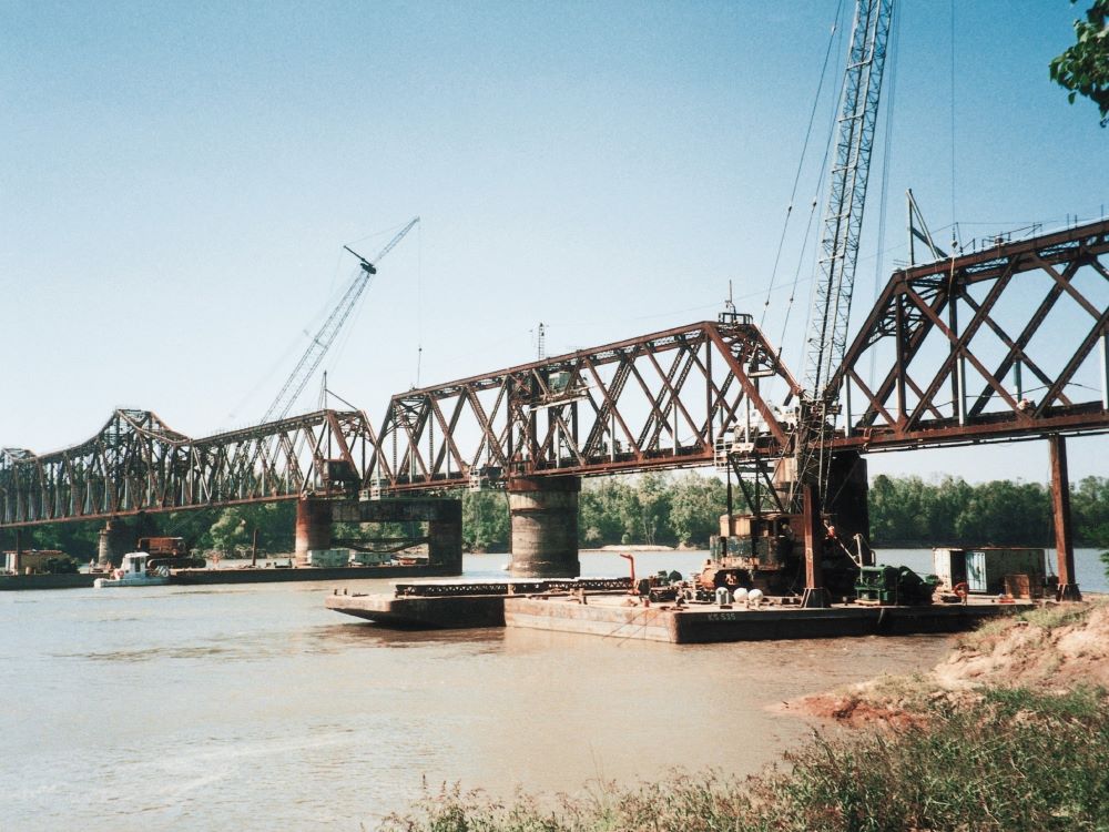 Completed in 2001 by Johnson Bros. Corporation, the Atchafalaya River Bridge Reconstruction project consisted of the replacement of the center lift span on mainline bridge over the Atchafayla river. Very tough conditions with deep water, strong currents, tidal fluctuations, and working within windows of time daily dictated by the Railroad in order to keep the mainline open for trains and being able to open the bridge for marine traffic. Scope included completely rebuilding the 275 linear feet long center lift span of the bridge. Completely razed and replaced all ties, beams, bolts, bent caps, plates, shives, rollers & bearings, drove new 54-inch coated piling 150 foot long, erected 5 new bent caps assembled to the new piling under the existing bridge and jacked into place and bolted the new cap to the pile. Eventually dismantled existing deteriorated caps.