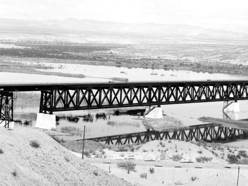 Completed in 1945 by American Bridge, the BNSF-Colorado River Bridge A-567 is a 1,507-foot double-track ballasted deck railroad bridge with four 100-foot deck girders, three 350-foot deck trusses, and one 50-foot beam span, built for AT&SF Railway, now BNSF Railway.