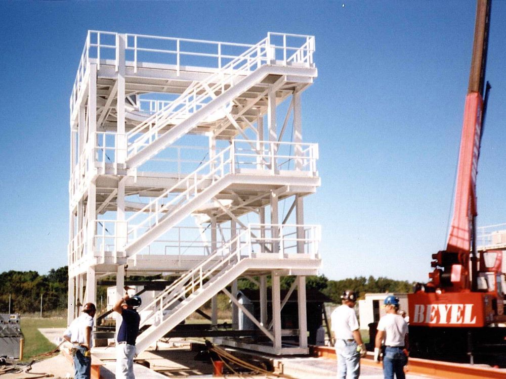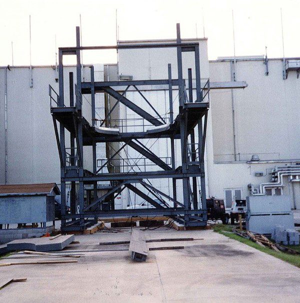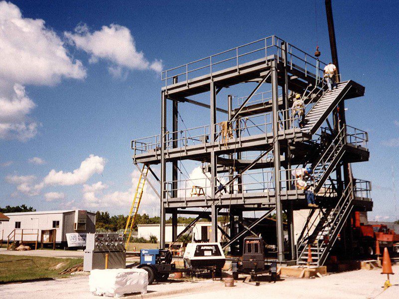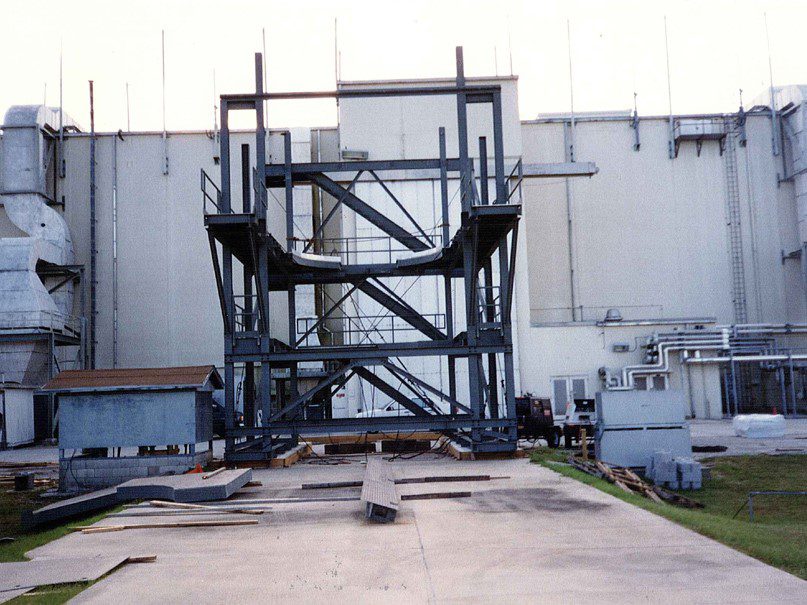 Completed in 1998 by American Bridge, the Boeing Delta III Second Stage Test Stand project involved constructing a 37′ steel test stand for rocket assembly, including platform articulation, painting, and concrete work. Due to space constraints in Building AO, the stand was built externally on a temporary foundation and moved inside using a custom air cushion jacking system with just 1″ clearance, ensuring a perfect fit without damage.