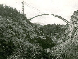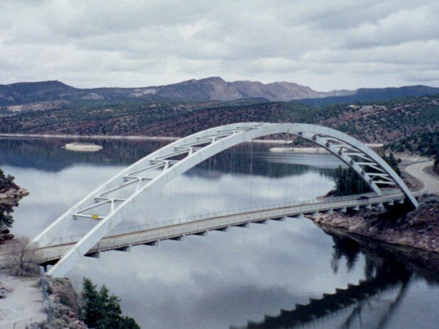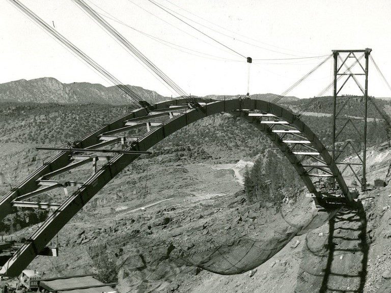 Completed in 1962 by American Bridge, the Cart Creek Bridge project consisted of erecting a steel through-arch bridge with a 550′ span, suspended 210′ above the canyon floor. The 28′ roadway is supported by 1-3/4″ cables. Fabricated from 970 tons of steel, the arch has box chords and a 90′ rise. After the Flaming Gorge Dam was built, water levels rose to 30′ below the roadway.