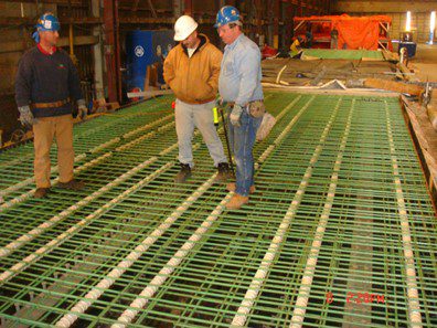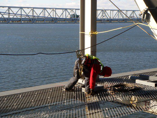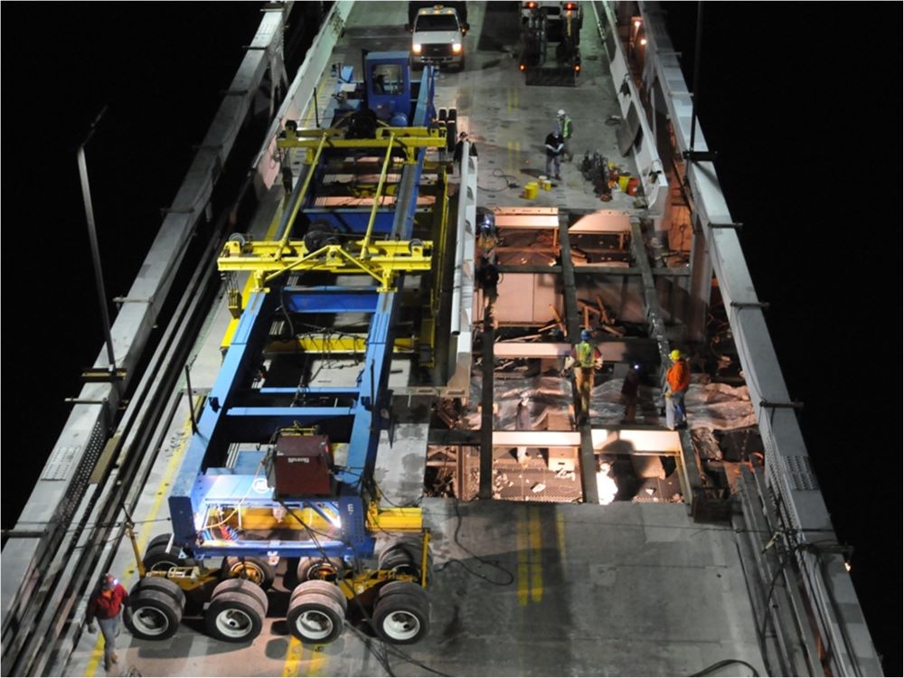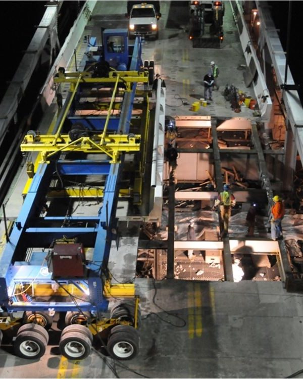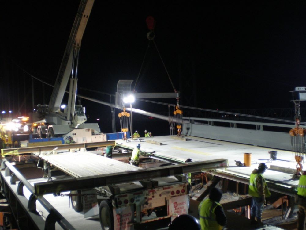 Completed in 2010, the Chesapeake Bay Bridge Redecking project involved replacing 193,000 SF of deck on the westbound suspension and cantilevered truss spans with precast, post-tensioned units during nighttime lane closures. The 2,950′ suspension bridge received lightweight concrete composite deck units, while the 1,720′ cantilevered truss bridge got precast concrete slabs. American Bridge manufactured the deck units and steel components near the site. Other work included replacing steel traffic barriers, four expansion dams, installing aerodynamic stabilization, acoustic sensors, and painting the through truss. The project also included repairs to a ferry terminal. Self-performed work involved bridge jacking, steel railing replacement, joint rehabilitation, concrete placement, structural repairs, and traffic management.
