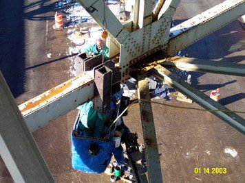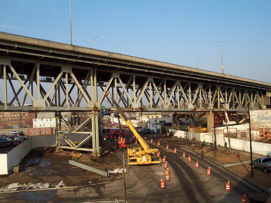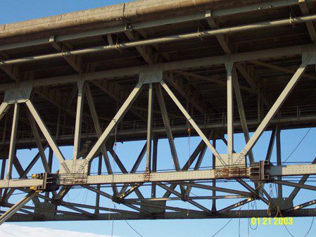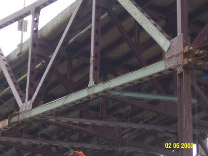 Completed in 2003 by American Bridge, the Chicago Skyway Commercial Avenue Viaduct Rehabilitation involved structural steel repairs on the 13-span west approach to the Calumet River Bridge. The project covered 2,384 feet, including girder and deck truss spans, and required extensive bearing replacements, truss member repairs, and steel fabrication (940,000 lbs). Work was done under live traffic with minimal disruption. It was adjacent to a similar project on the 2,458-foot Calumet River Bridge.