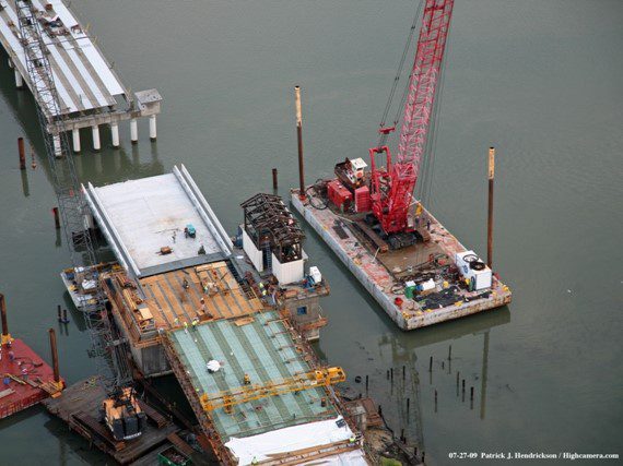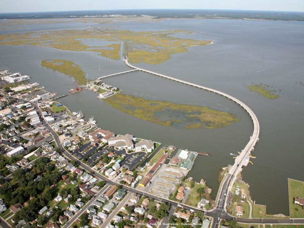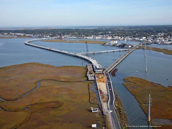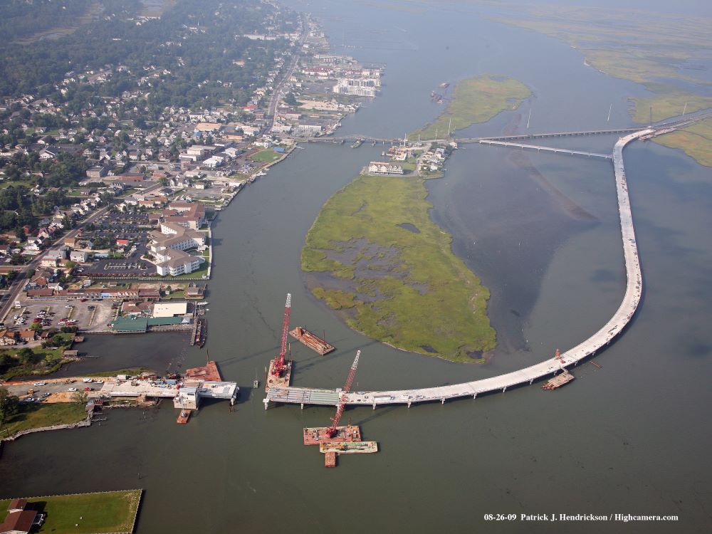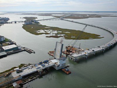 Completed in 2012, the Chincoteague Bridge RT 175 project involved constructing a 4,764’ replacement bridge for Virginia Route 175, including a 4,035’ mainline and a 729’ connector to Marsh Island. The two-lane bridge features 80’ precast concrete girder spans on cast-in-place cylinder piles. The project included a 92’ single-leaf trunnion bascule span with 123’-6” girders and 417,460 lbs of structural steel. A total of 292 concrete cylinder piles were driven, some reaching -129’ using a 30’ follower. The contract also included demolishing the existing bridge.