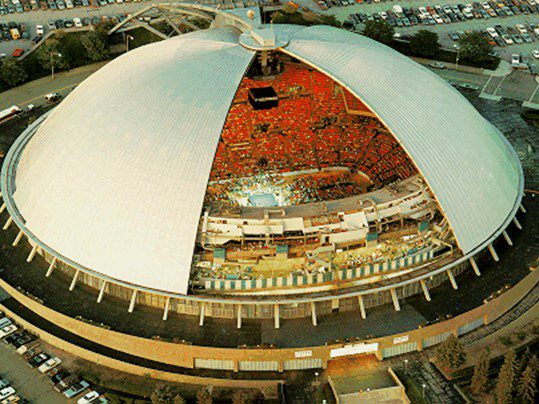 Completed in 1961 by American Bridge, the Civic Arena featured a 409′ diameter dome roof with six movable leaves and two fixed leaves, supported by a cantilever space frame. The leaves moved on three tracks with 175# rails.