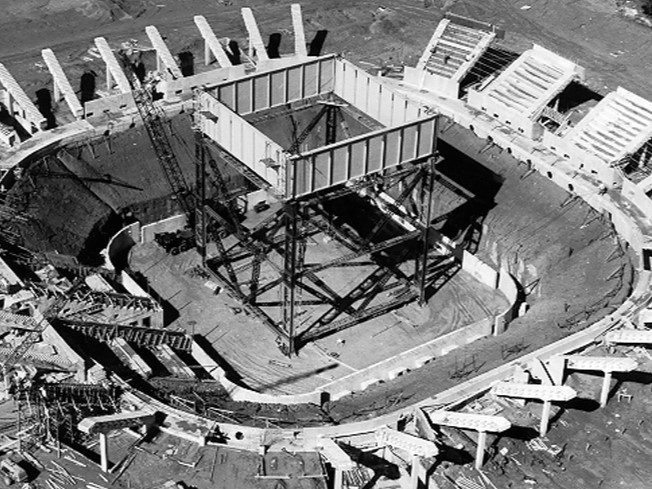 Completed in 1968 by American Bridge, the Clemson Arena project consisted of a 300′ x 300′ multipurpose arena framed by 15′ deep welded girders in 60′ x 60′ bays.