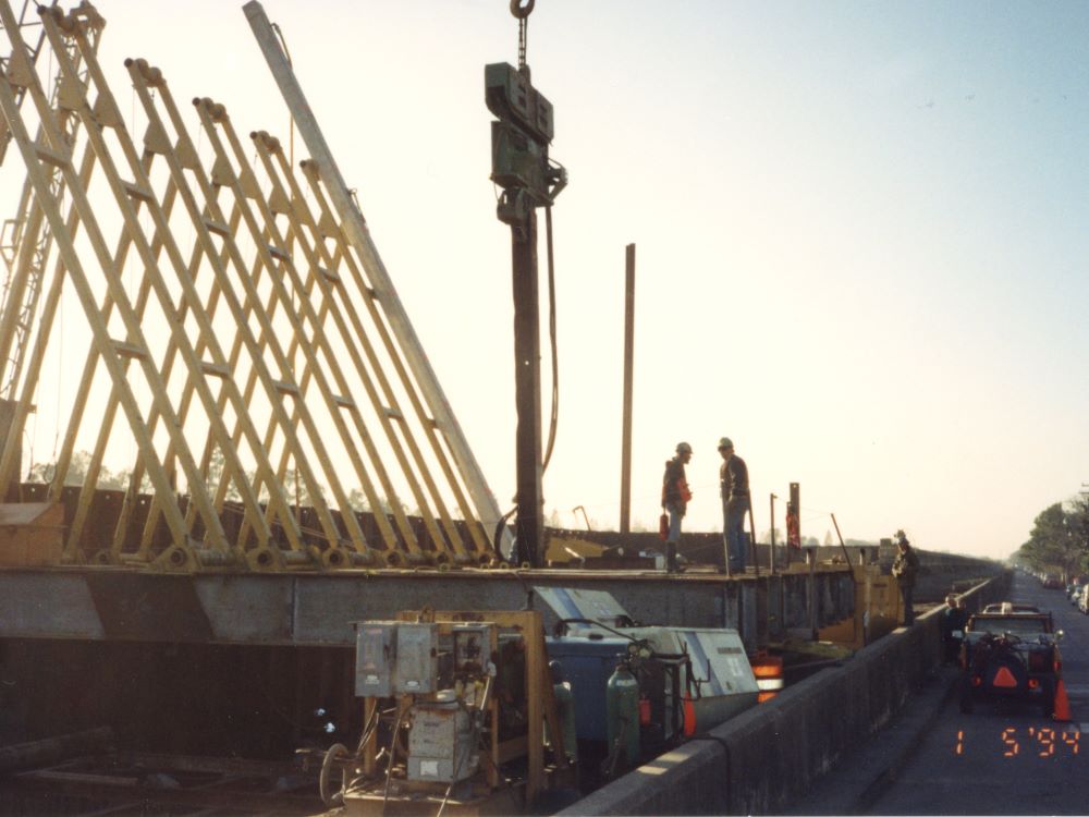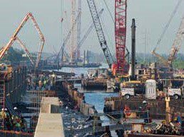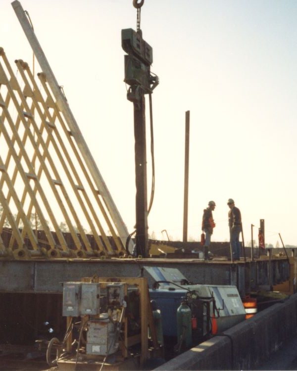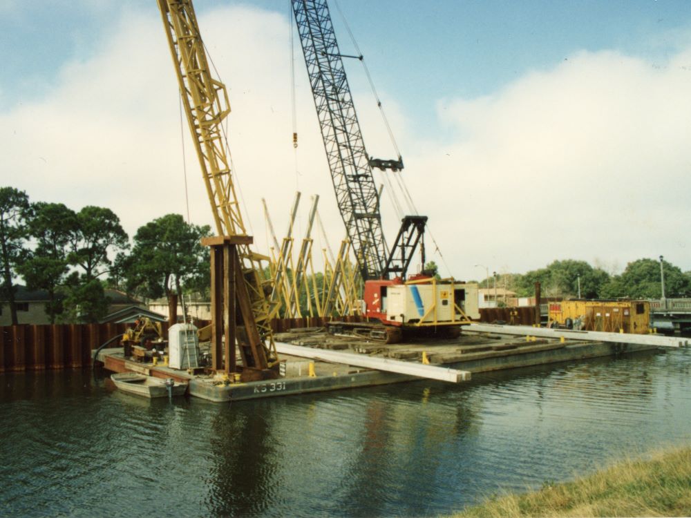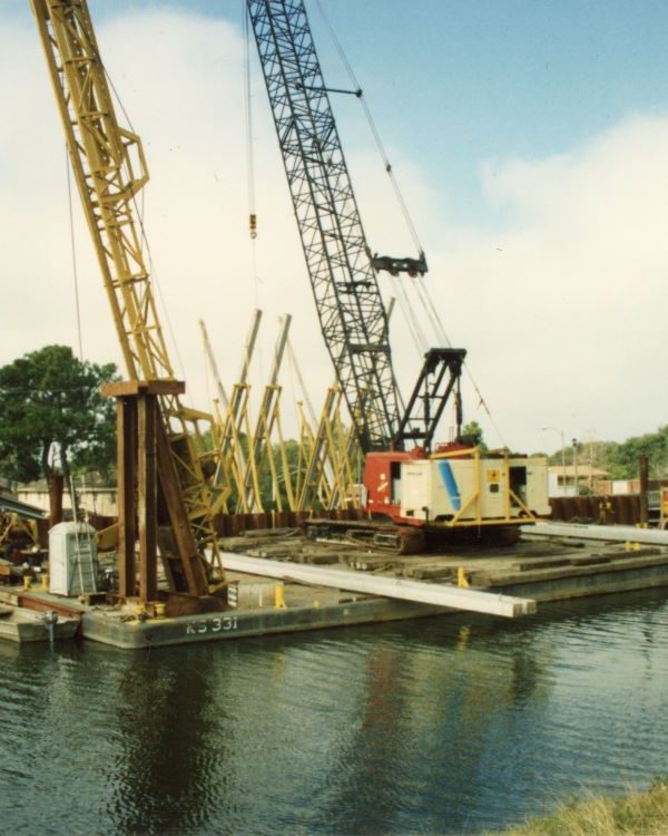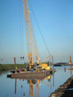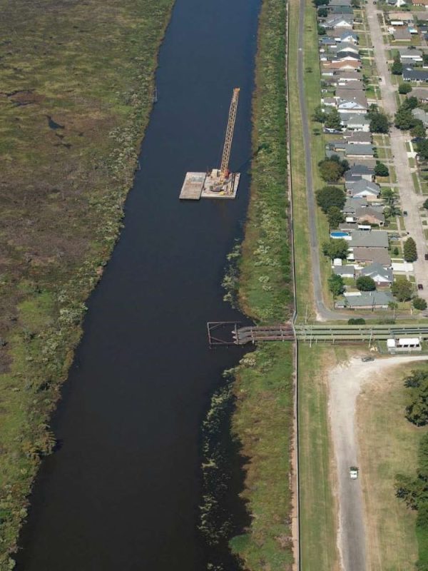 Completed in 2012, the COE West Return Levee Walls Project is considered Best Value Construction of 3.2 miles of Post Katrina T Walls and demolition of existing T-Wall. Landscaping of new wall area and pump station. Work on this contract consisted of excavation of a floating channel the length of the project., Clearing and grubbing, installation of steel sheet piles, steel H piles, cofferdams, temporary retaining structures, prestressed concrete piling, reinforce steel, cast in place concrete floodwalls, structural steel, steel flood gates, stone Rip Rap placement, massive dewatering, painting, modification of existing pump stations and 72-in discharge piping. Also, demolition of the existing flood wall and footings, establishment of turf, landscaping of trees and bushes, asphalt roads and trails. All of this work was performed for the entire 3.2 miles of the project. At max conditions there were 252 crafts and tradesmen, 54 barges, 5 tugboats, 16 cranes, working in as many as 22 different fronts along the project site. Averaging pouring 500 cubic yards concrete per day. This project was completed ahead of schedule.