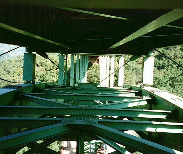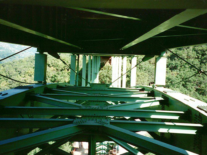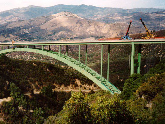 Completed in 1998 by American Bridge, the Cold Springs Canyon Bridge Seismic Retrofit reinforced the 1,148-foot deck arch bridge originally built by the company in 1962. The project included bolted steel plate reinforcements, new caissons, grade beams, concrete anchors, expanded thrust blocks, and tensioned steel cables. Major bracing was added for seismic stability, with all work completed while keeping the bridge operational.
