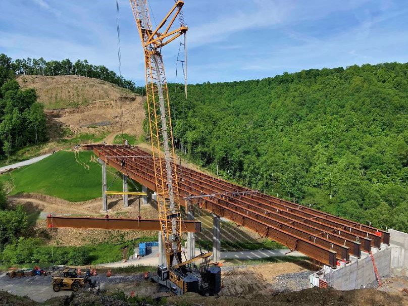 Completed in 2023 by American Bridge, the West Virginia Corridor H project extended US 48 with 7.5 miles of new four-lane highway, five mainline bridges, and access roads. Partnering with Kokosing, AB handled the complex erection of five plate girder bridges, ranging from 600 to 1,000 feet in length. Construction, largely within the Monongahela National Forest, included measures to minimize environmental impact. ABs in-house engineering developed erection methods, falsework design, and crane logistics to ensure safe and efficient bridge assembly.