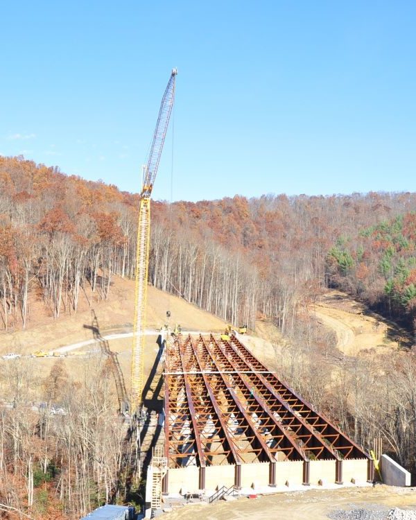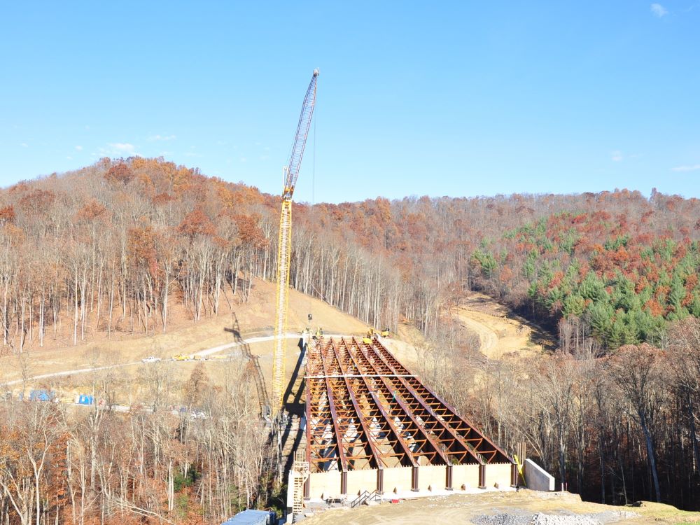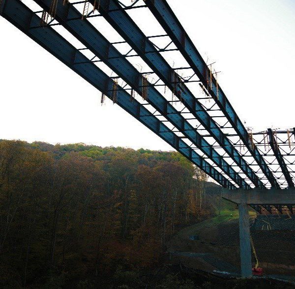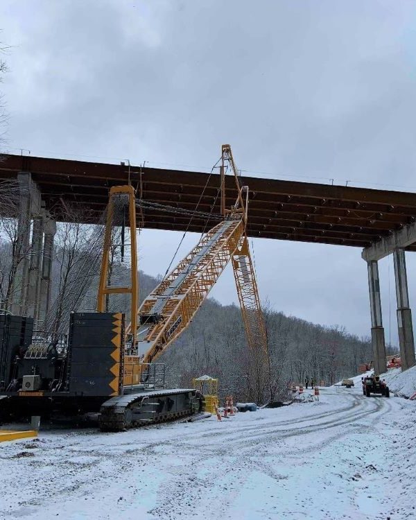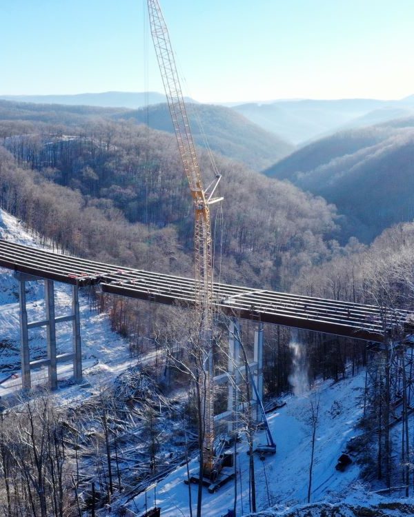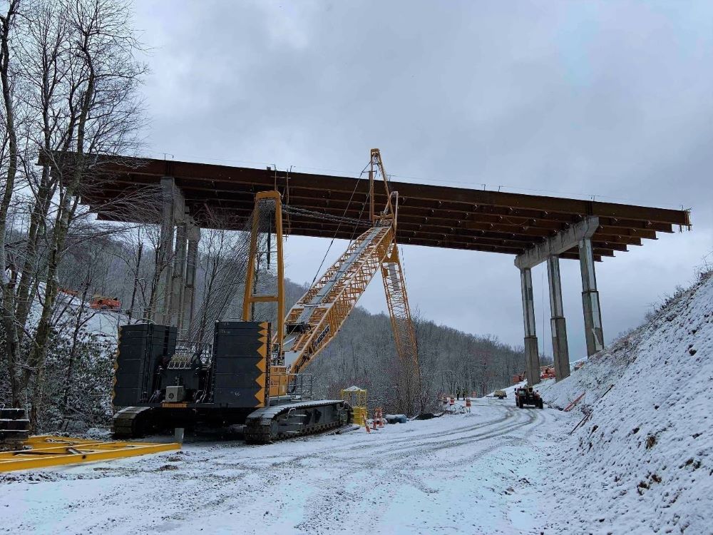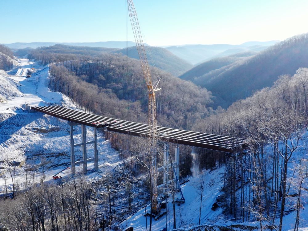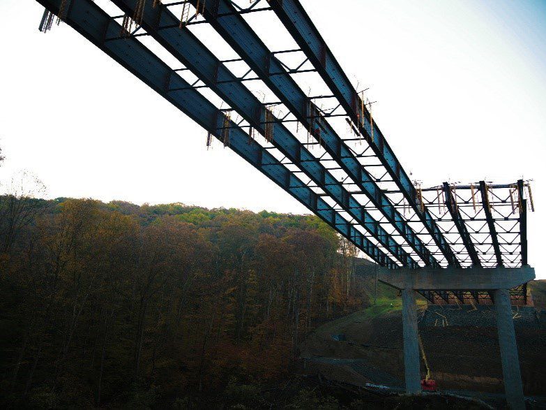 Completed in 2023 by American Bridge, the West Virginia Corridor H project extended US 48 with 7.5 miles of new four-lane highway, five mainline bridges, and access roads. Partnering with Kokosing, AB handled the complex erection of five plate girder bridges, ranging from 600 to 1,000 feet in length. Construction, largely within the Monongahela National Forest, included measures to minimize environmental impact. ABs in-house engineering developed erection methods, falsework design, and crane logistics to ensure safe and efficient bridge assembly.