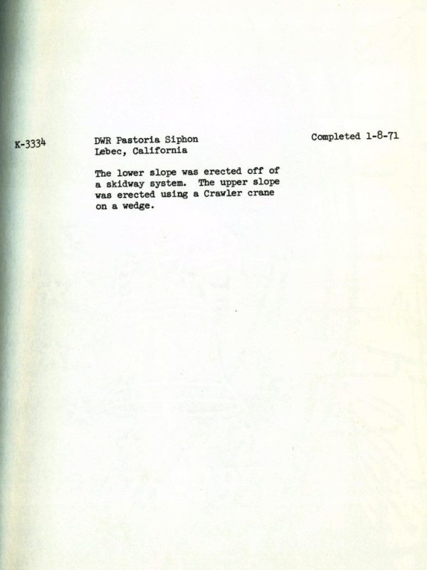 Completed in 1971 by American Bridge, the DWR Pastoria Siphon project consisted of fabricating and installing welded steel water supply siphons and pipelines. The lower slope was erected using a skidway system, while the upper slope was erected with a crawler crane on a wedge.