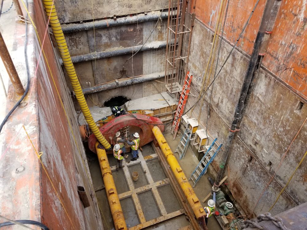 Completed in 2020 by Southland Contracting, the E-19 Sequin Road to Nacogdoches Road, Segment 1 Project consisted of the replacement and upsizing of 3.1 miles of 48-inch gravity wastewater mains with larger 78-inch mains, as well as the elimination of one siphon and the abandonment of the existing 48-inch main. The project included 6,340 linear feet of 96-inch microtunnel with nine individual drives. Three of the drives were over 1,000 feet with the longest being 1,325 feet. Each tunnel consisted of jacking 96-inch steel casing with a Herrenknecht microtunnel boring machine (MTBM), followed by the installation of 78-inch Hobas fiberglass reinforced (FRP) sewer pipe. The bore depths for each drive were in the 25 to 30-foot range. The project was unique in that a portion of the tunneling was below the Fort Sam Houston military installation. The project team worked closely with military officials to achieve construction goals while helping to maintain security and traffic circulation for the base. In addition, approximately 100 linear feet of tunnel was constructed under the Union Pacific railroad. The open cut portion of the pipe was installed at depths in excess of 35 feet in a narrow street right-of-way. Portions of the open cut and tunnel were installed in solid rock. The ground conditions varied, but in general, it was a sandy gravel mix on top, a clay mix in the middle, and a hard dense clay shale at the bottom that required hammering or other mechanical excavation methods. The northernmost 10,000 feet of the job was installed approximately 50 feet off of a major waterway, which resulted in wet and challenging ground conditions needing extensive dewatering. The scope of work also included multiple manholes, an 8-inch water line, a 16-inch water line, an 8-inch sewer line, a 10-inch sewer line, bypass pumping, pavement restoration, and road construction. The bypass required four 18-inch pumps to handle the 35 million gallon per day flow of the existing sewer line.