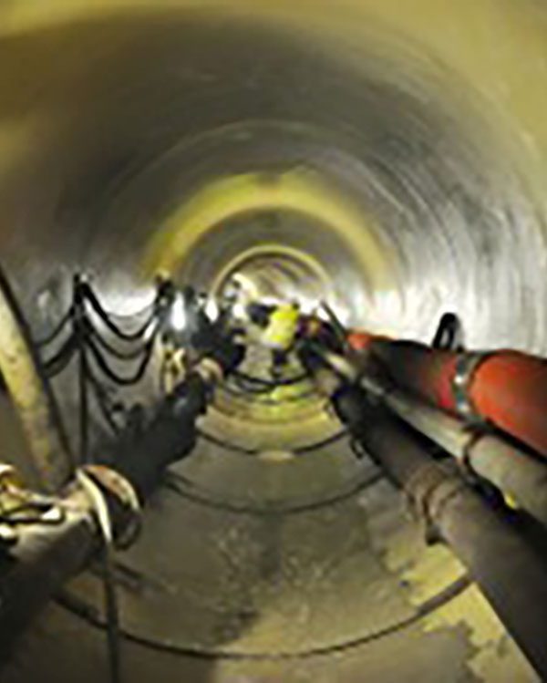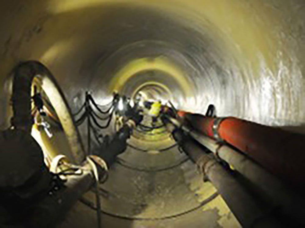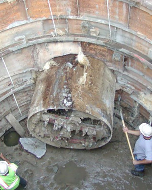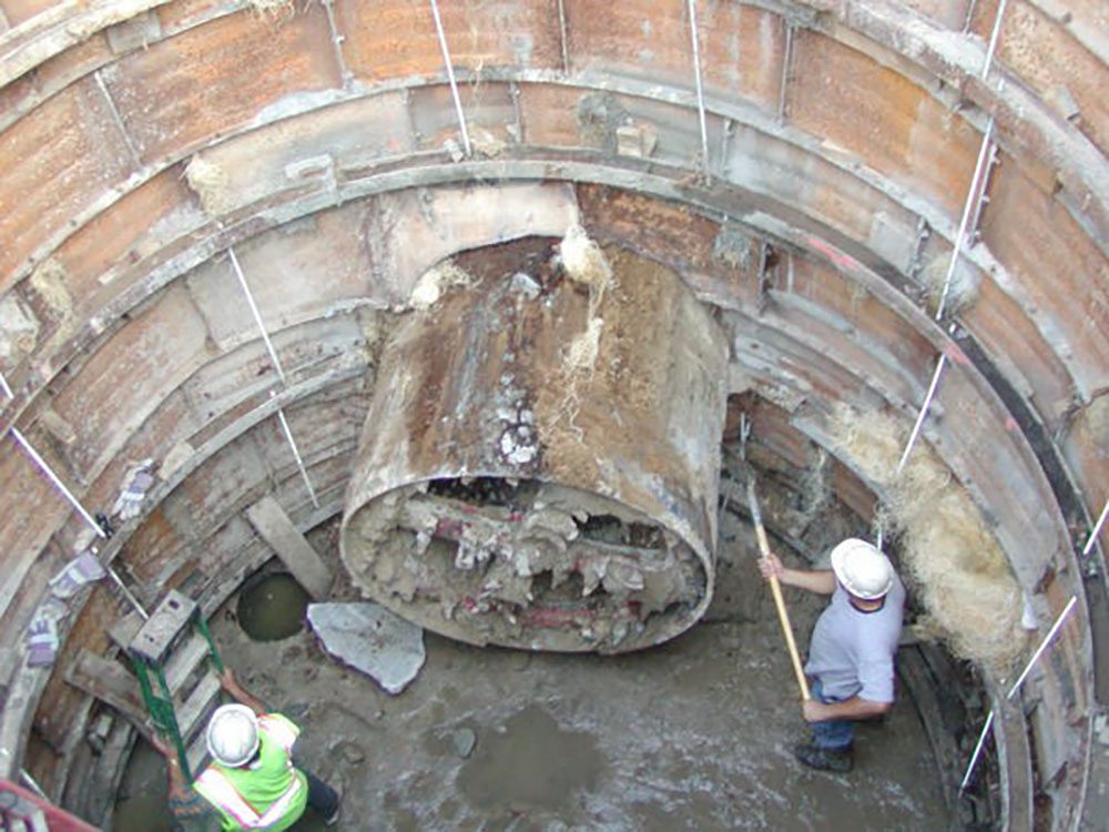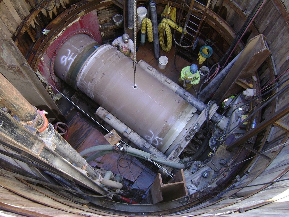 Mole Constructors completed the excavation of 6,077 linear feet of tunnel using a Tunnel Boring Machine (TBM). They jacked 84-inch Reinforced Concrete Pipe (RCP) for a sanitary sewer and slip-lined it with 72-inch Hobas pipe. The tunnel excavation was performed with a 103-inch MST Microtunnel Boring Machine, with runs reaching a maximum length of 850 feet. Twelve shafts, ranging in depth from 40 to 60 feet, were supported with steel sheeting and dewatered. Additionally, eleven manholes were constructed, along with one 30-foot diameter chamber.