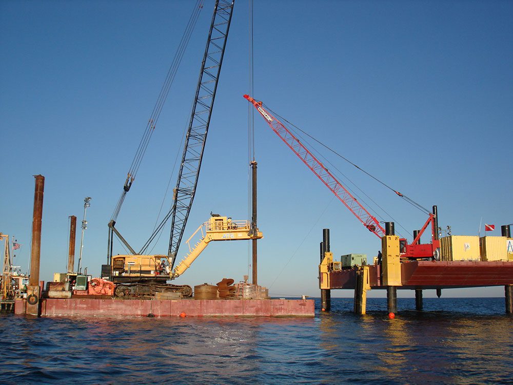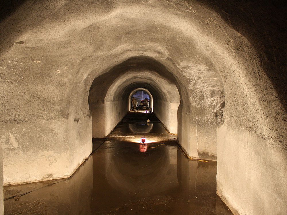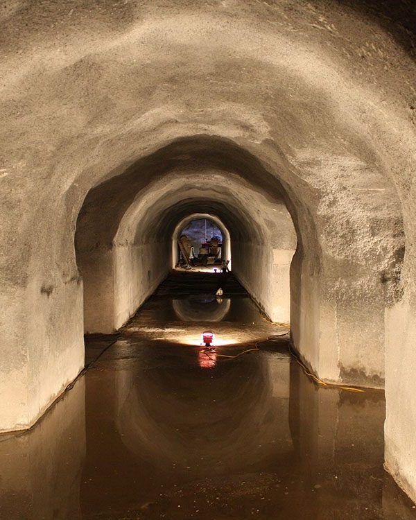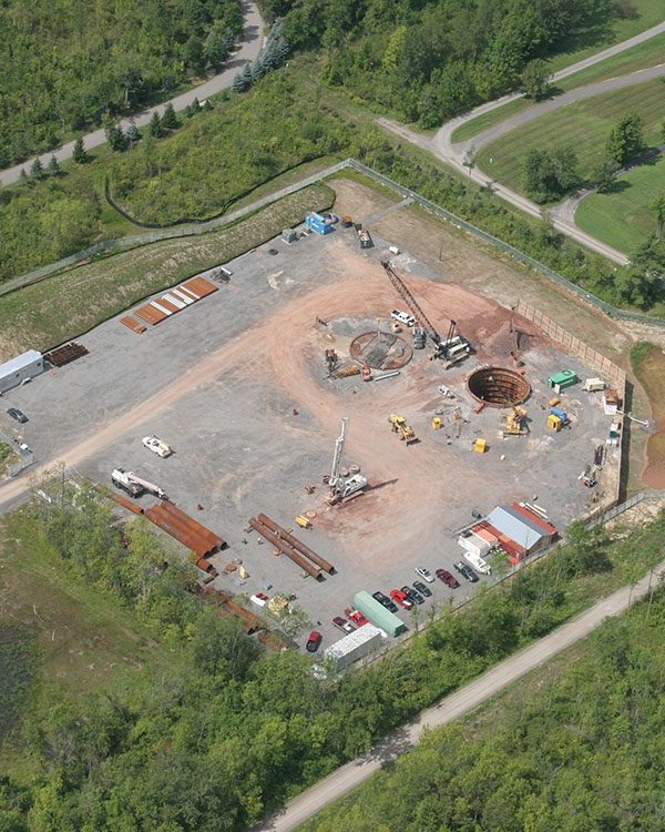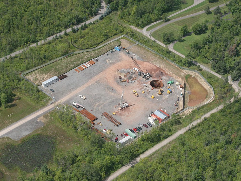 Completed in 2013 by Southland Contracting, the Eastside Water Supply Project Raw Water Intake Tunnel Project consisted of the construction of one 45-ft-diameter shaft 170 ft deep; 6,000 lf of 114-in tunnel under Lake Ontario with a 4-in-thick shotcrete liner; six 60-in drilled pump shafts 100 ft deep; 220 lf of 12-ft main pump adit tunnel excavated by drill and shoot methods and two marine intakes (114-in- and 36-in-diameter, 60-ft deep in 60 ft of water) approximately one mile offshore on Lake Ontario. The 45-ft-diameter shaft was also lined with a 2-ft-thick concrete liner and had two 144-in roller wheel gates installed to regulate the intake water from Lake Ontario. The tunnel was excavated in the Queenstown Shale formation. The rock support for the tunnel included only rock bolts in the crown and rock bolts with wire mesh in the crown of the tunnel. As described below, we had a change in conditions on this project due to the shale formation encountered in the tunnel. We overran the bolts/mesh support by 200%+ due to the overbreak and slaking/drying of the shale. This created some challenges and safety concerns we had to overcome. At one point during the mining we had to cease operation and go back and re-support the entire tunnel and install mesh and shotcrete (only bolts were directed to be installed). Lesson learned was that the tunnel should have been supported with bolts and mesh the entire length of the tunnel due to the fallout of the shale formation. The marine work also had challenges of its own. The drilled intake shafts were approximately one mile offshore. The nearest launch site for the marine barge/tug equipment was over 15 miles away. To push the barges one way was an approximately 5- to 6-hour voyage. Within a matter of hours, the wind could pick up on the lake and cause very high, choppy waves that could damage cranes and barges. We always had to be on the lookout and make decisions each day regarding whether it was safe to work on the water. Due to the weather, we only had a short window to work on the lake from May to October. Due to the conditions on the lake, we invested in a jackup platform barge for the tendering crane operations. This setup allowed us to jack the barge up out of the water to ride out the storms, wind, and waves. There was not any soil overburden at location of the intakes in the lake. The bottom of the lake was essentially bedrock (shale). We had to drill and shoot a massive excavation out of the lake bottom. This required underwater blasting using divers to insert dynamite into the drilled holes. Once the rock was blasted, the rubble was removed with dredging, air lifting, and clamming techniques.