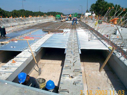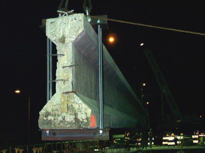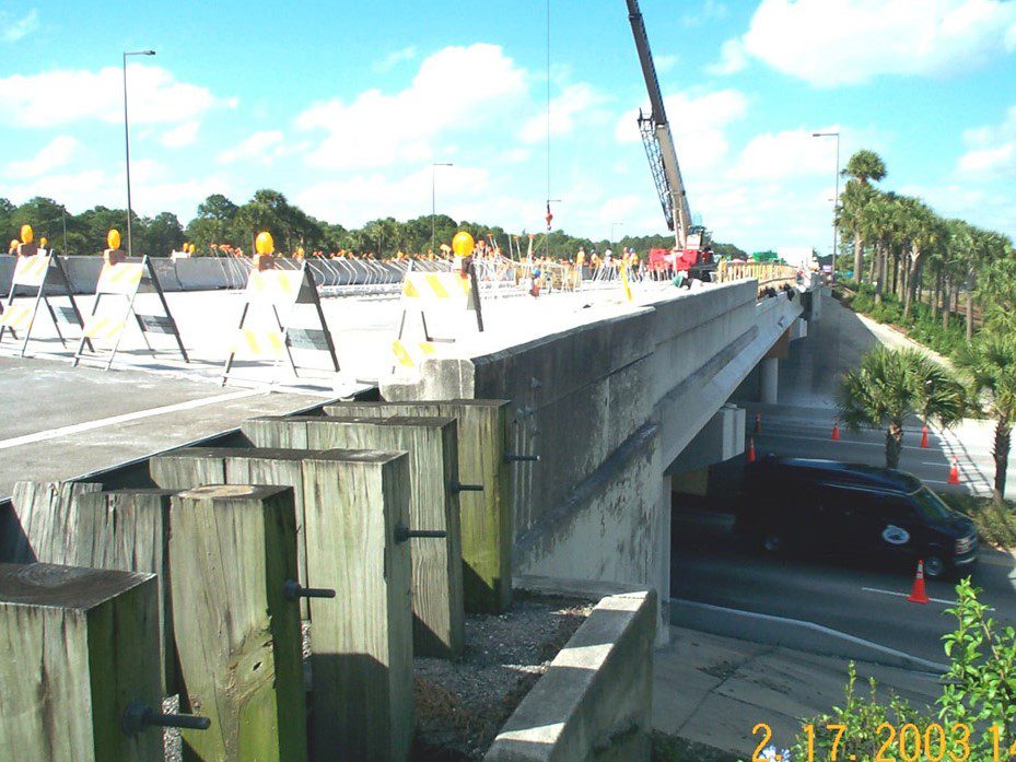 American Bridge performed emergency repairs to this existing three-lane bridge carrying traffic on a six-lane divided highway over a four-lane median divided highway. Major emergency repairs became necessary when the bridge was struck by an over height transport. The scope of work included the replacement of three AASHTO Type IV concrete girders, overhangs, and barrier wall. A new cast-in-place concrete deck was placed. All work was undertaken at night. The 40-ton, 100-foot girders were erected over the roadway using a 500 ton hydraulic truck crane, with all erection engineering and erection provided by American Bridge Company.