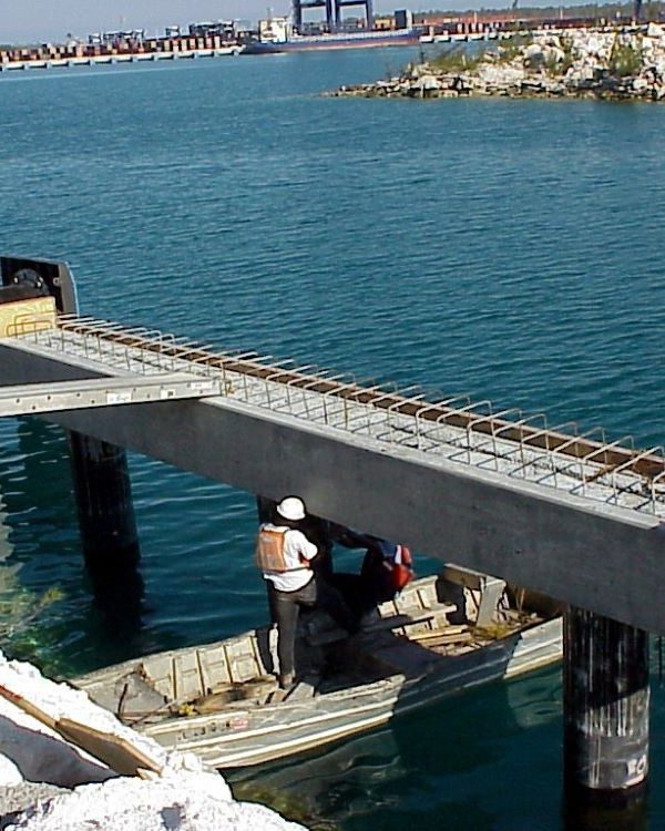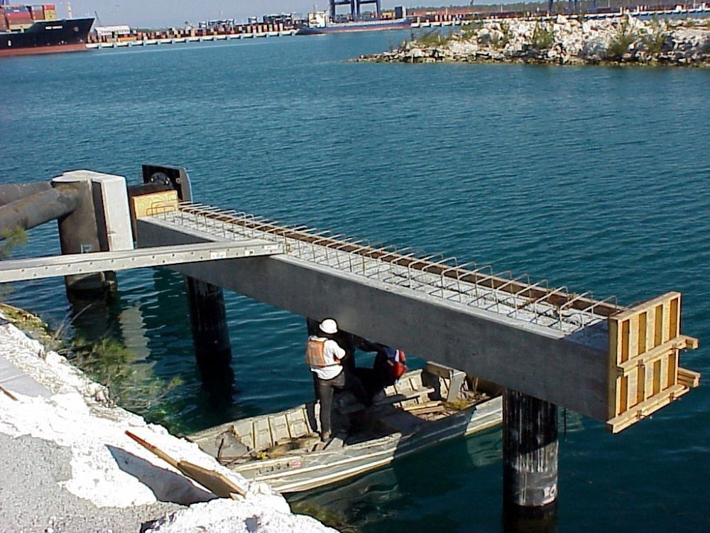 Completed in 2001 by American Bridge, the FOCOL Fuel Transfer Platform project consisted of a design/build 35’ by 20’ concrete dock structure supporting three rotating counterweight marine arms. The work included installation of 3” by 24″ pipe piles, a precast substructure and deck section, and a concrete deck topping wear surface.