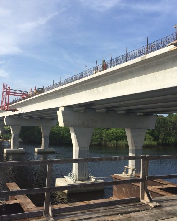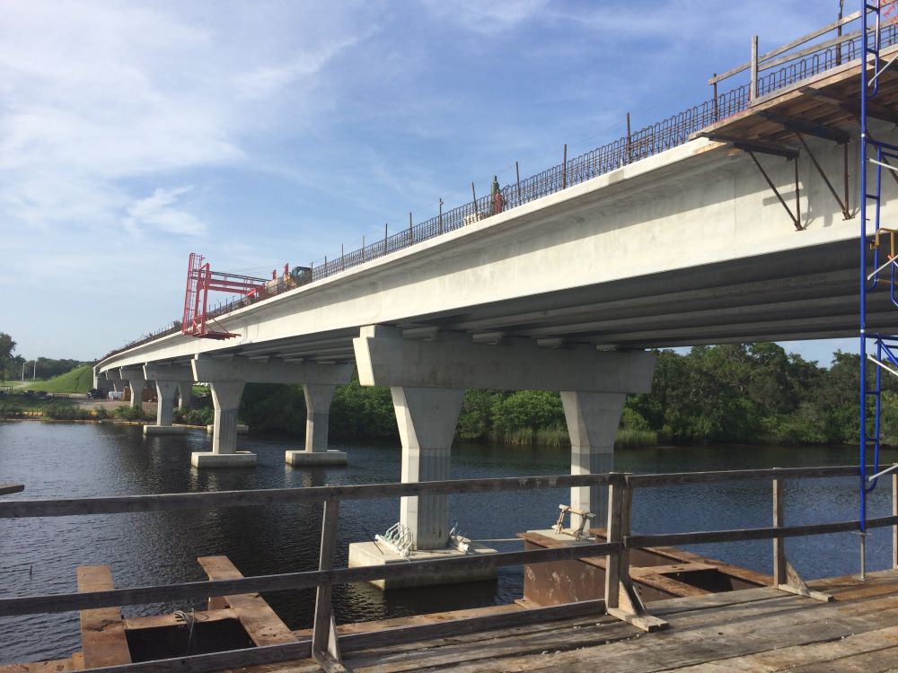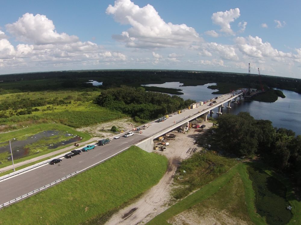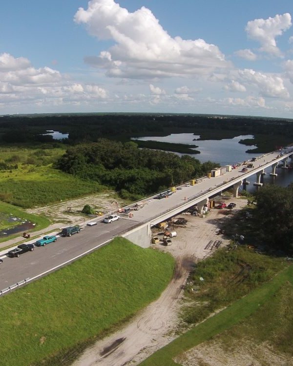 Completed in 2017, the Fort Hamer Bridge Project with Road Improvements on Fort Hamer Road and Upper Manatee River Road project consisted of the construction of a new river bridge and roadway connecting the existing Upper Manatee River Road south of the river to the existing Fort Hamer Road north of the river. The total project length is 1.4 miles. The bridge carrying two traffic lanes is approximately 2,318 feet and comprised of 18 spans ranging in length from 100 feet to 144 feet. Additional roadway improvements along Upper Manatee River Road included widening, sidewalks, bike lanes, turn lanes, utilities and intersections with Fort Hamer Bridge.