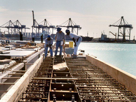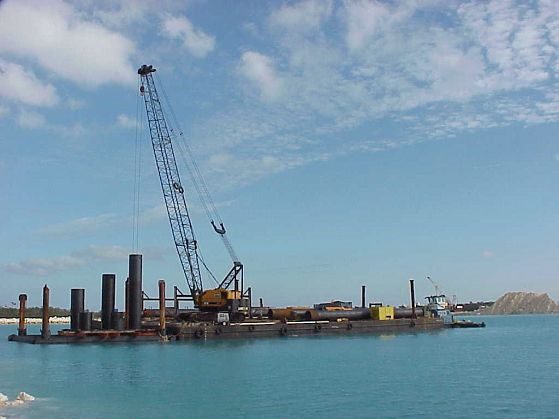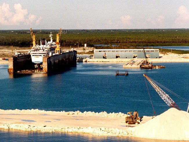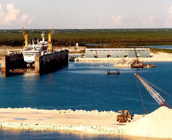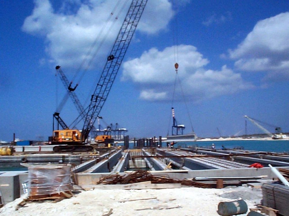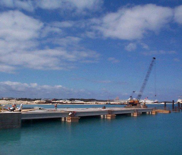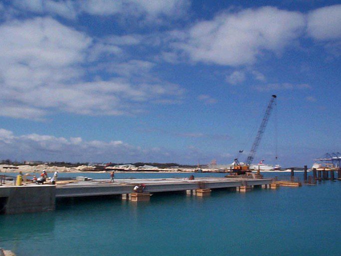 Completed in 2001 by American Bridge, the Freeport Ship Care Facility in the Bahamas involved constructing a new ship repair yard under a lump sum contract. Marine work included a 496′ x 65’7″ pier, a bulkhead, eight mooring dolphins, ship fenders, bollards, and a 496′ catwalk. The pier consisted of AASHTO Type-3 girders on pipe piles driven to -95′. The bulkhead spanned 1,247LF with tied-back steel sheet walls. Landside work covered 18.3 acres, featuring a paved storage area, roadways, utility banks, a 13,000SF office, and a 70,000SF workshop with a 20-ton barge crane.
