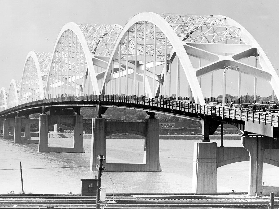 Completed in 1940 by American Bridge, the Galbraith Bridge project consisted of a thirteen-span bridge over the Mississippi River between Rock Island, Illinois, and Davenport, Iowa. The structure includes five tied arch spans—three measuring 391 feet 5 inches and two measuring 533 feet 9 inches—along with eight deck plate girder spans.