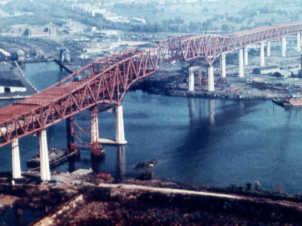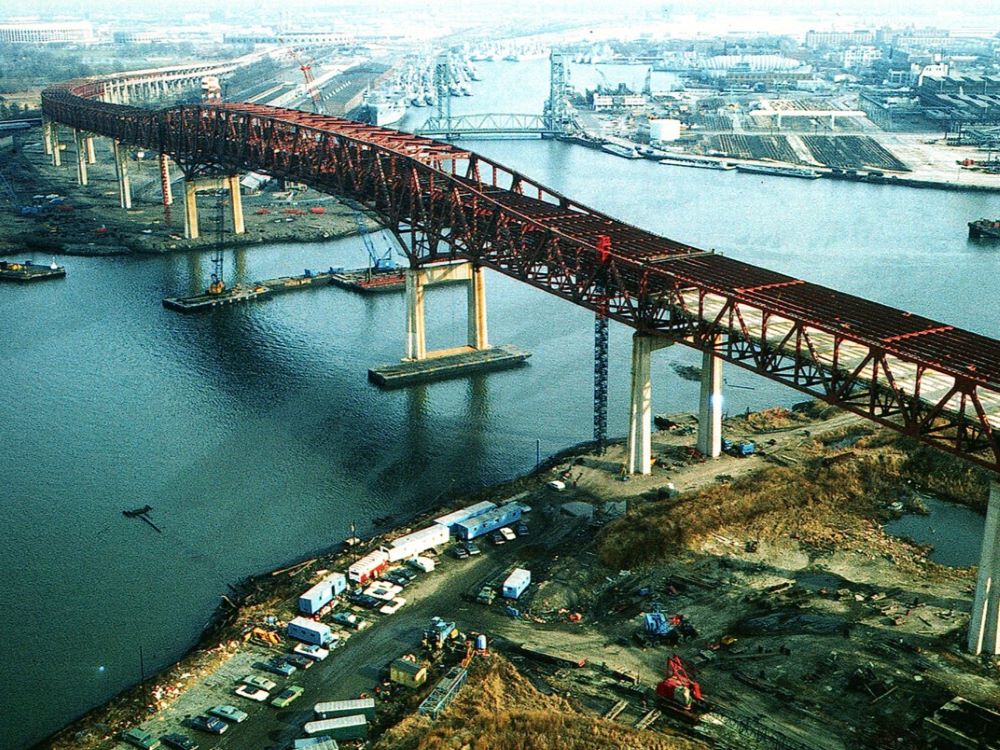 Completed in 1972 by American Bridge, the Girard Point Bridge is a 9,324′ (2,842m) two-level steel truss bridge on I-95 over the Schuylkill River in Philadelphia. Erected using balanced cantilever methods, it features 31,348 tons (28,438 tonnes) of structural steel fabricated by American Bridge.