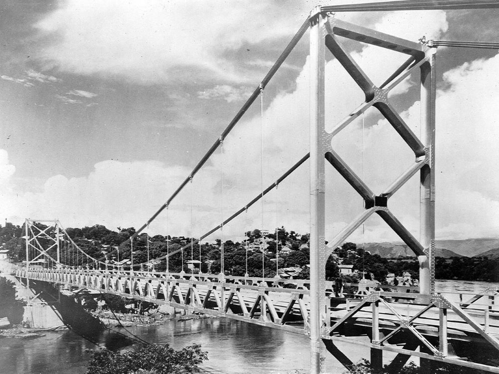Completed in 1949 by American Bridge, the Girardot Bridge project consisted of the fabrication and erection of a 693-foot (211 meters) roadway bridge, including a 505-foot (154 meters) suspension span over the Rio Magdalena River, located in Girardot, Colombia, S.A. The two main cables of the bridge were each made from 12 strands of 1-7/8″ (48mm) diameter wire.