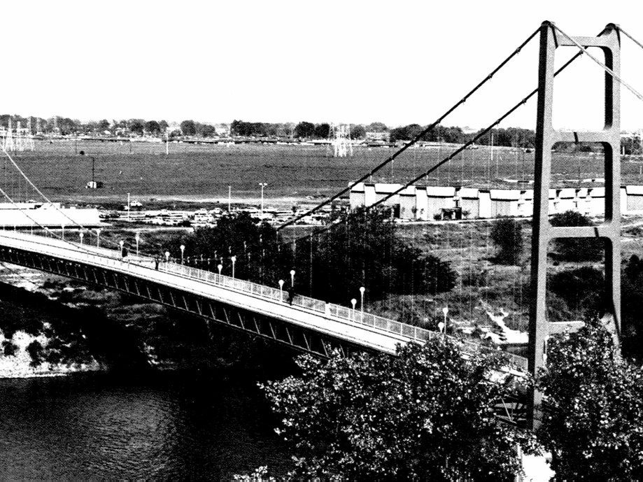 Completed in 1966 by American Bridge, the Guy A. West Pedestrian Bridge project consisted of the supply and erection of a 744’ (227m) pedestrian-only suspension bridge over the Sacramento River. The scope of work included the supply, fabrication, and erection of two 86’ (26m) welded steel plate towers and two main cables, each consisting of four 2 1/16” (52.4mm) galvanized bridge strands with a 70’ (21m) sag. The suspender ropes are ¾” (19mm) at 12’ (3.66m) centers. The stiffening truss is 16’ (4.9m) wide and 6’ (1.8m) deep.