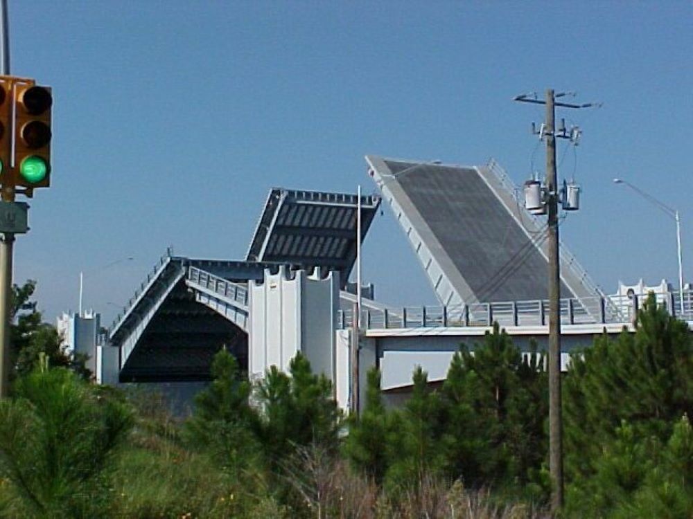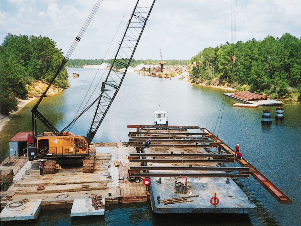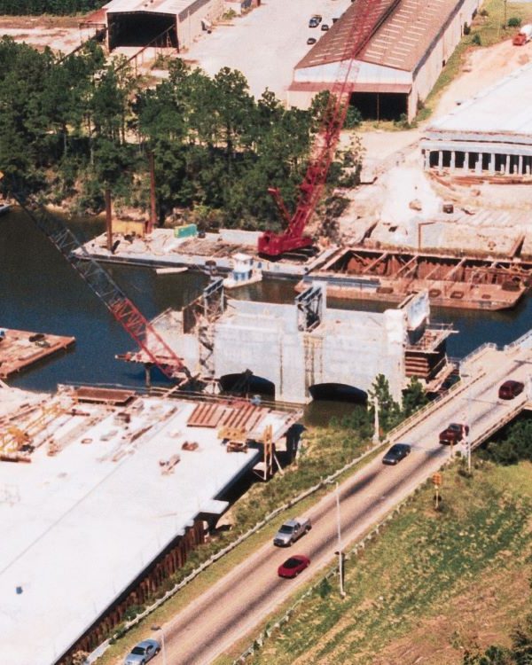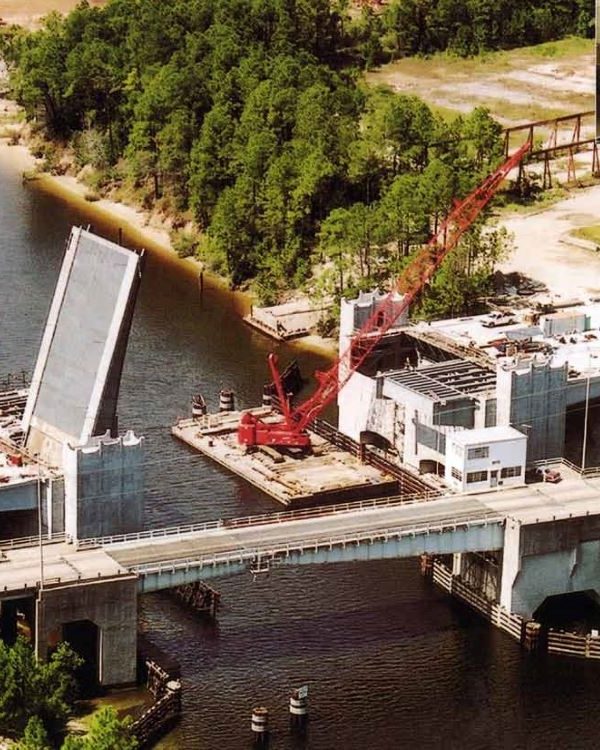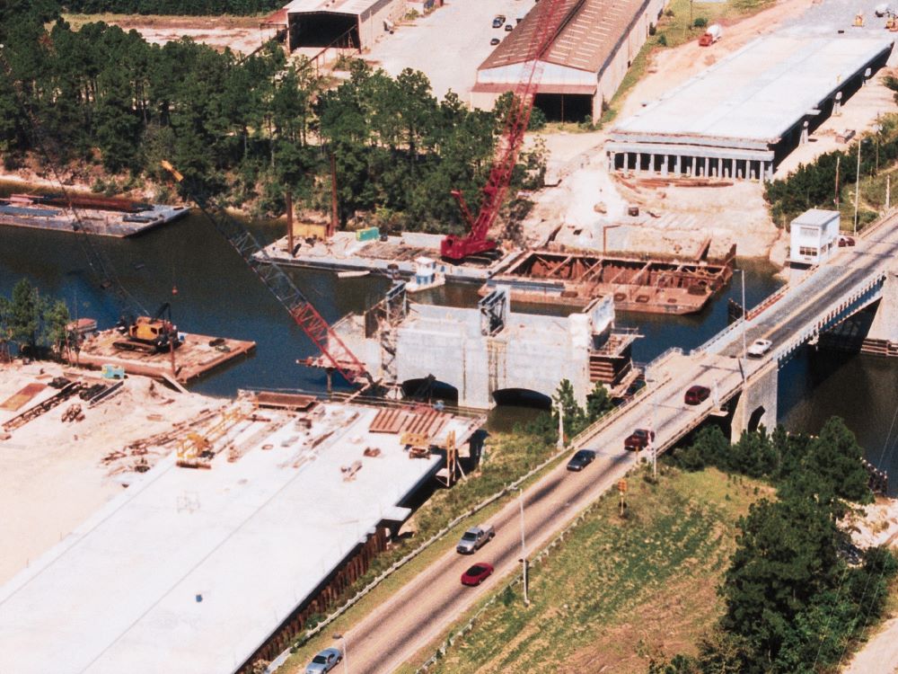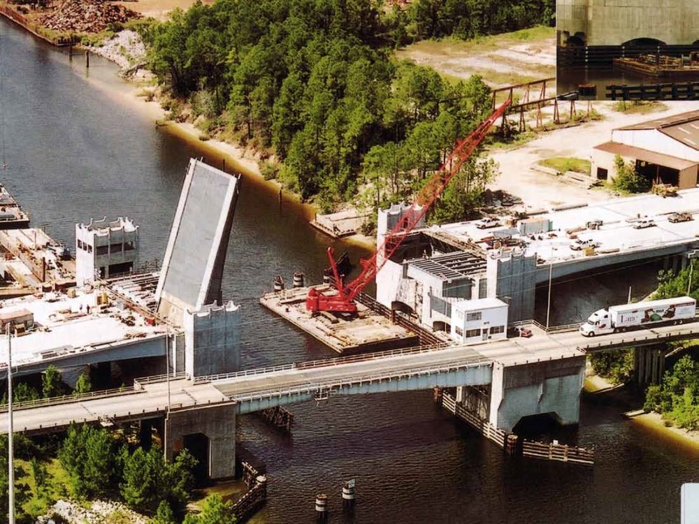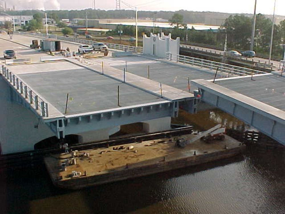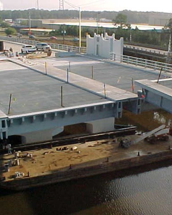 Completed in 2004 by Johnson Bros. Corporation, the Harrison Industrial Canal Bascule Bridge Replacement was a major Bascule Bridge/Causeway Project that included all roadway work, maintenance of traffic (MOT), barrier walls; erosion/sedimentation control; pavement removal; clearing & grubbing; demolition of existing structures; embankment; storm water system; curb & gutter; sidewalk; sodding; PCC; signalization (signing & marking); lighting; construction of 2 new double leaf 220 ft bascule bridges; all bridge construction off barges. Also, demolition of existing bridge and control house. This project was completed 2 months ahead of schedule.