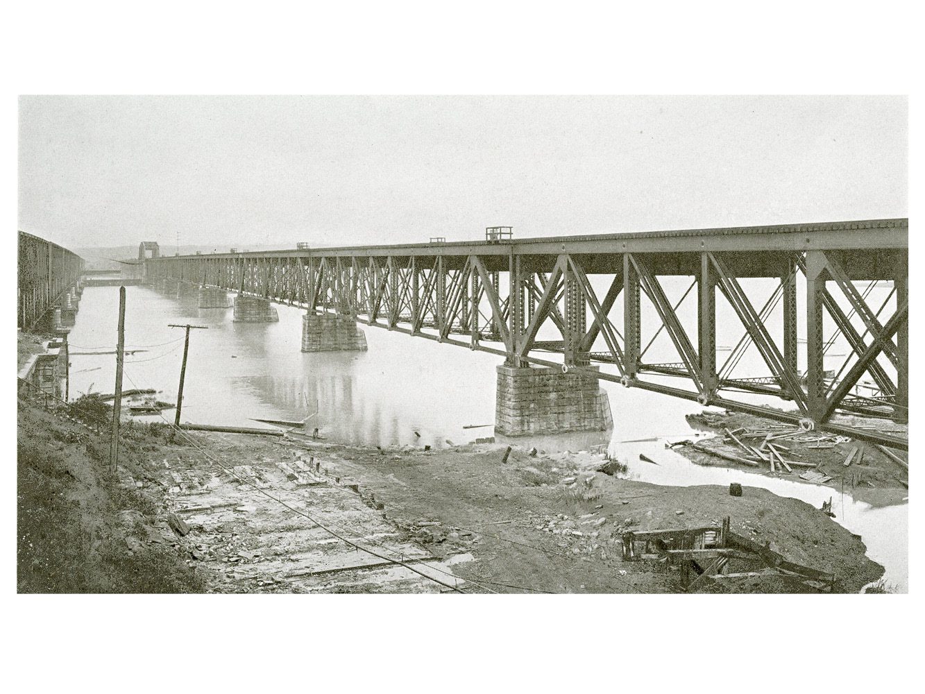 Consisting of the following double-track pin-connected deck spans: one fixed span, 192 ft 0-in c-c; eight fixed spans, each 255 ft 0-in c-c; one through lattice draw span, 277 ft -2-in c-c. Weight 6755 tons.