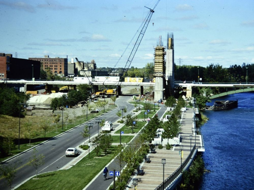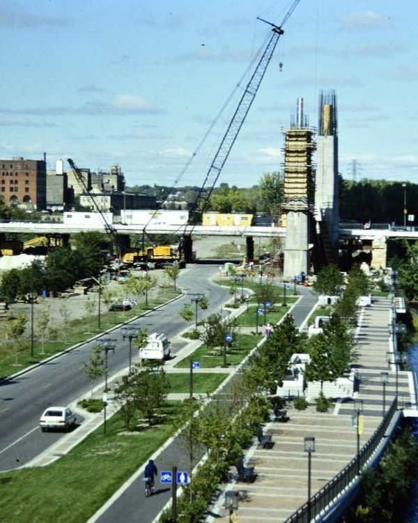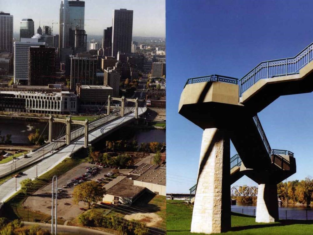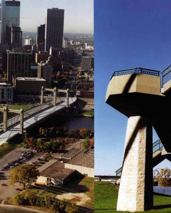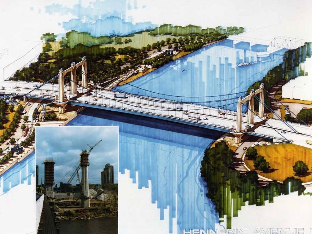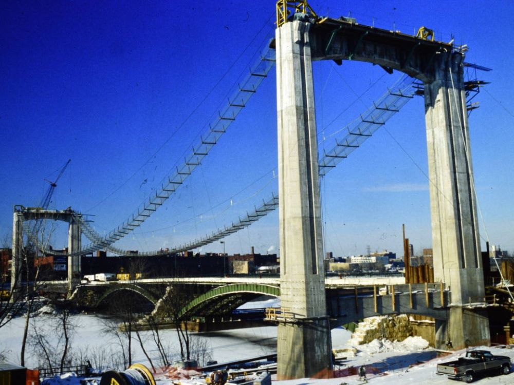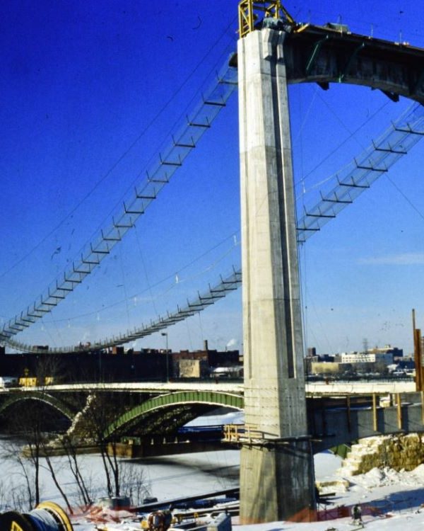Roughly Thousand-Foot-long Suspension Bridge. The girders below the bridge’s deck are steel, the 150-foot-high, obelisk-like towers were formed out of reinforced concrete, as are parts of the substructure and railings.