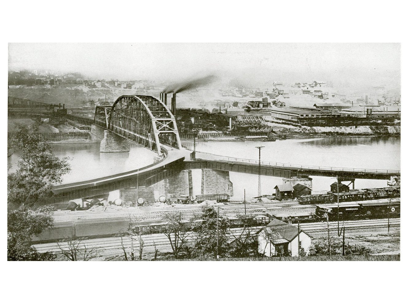 Channel span only, 396 ft 8-in c-c. Weight 1317.5 tons. Truss Bridge that crosses the Monongahela River. The bridge consists of two parallel spans on a single set of piers. the Hot Metal Bridge connected parts of the J&L Steel mill, carrying crucibles of molten iron from the blast furnaces in ladle transfer cars to the open hearth furnaces on the opposite bank to be converted to steel. During World War II 15% of America’s steel making capacity crossed over the Hot Metal Bridge, up to 180 tons per hour.