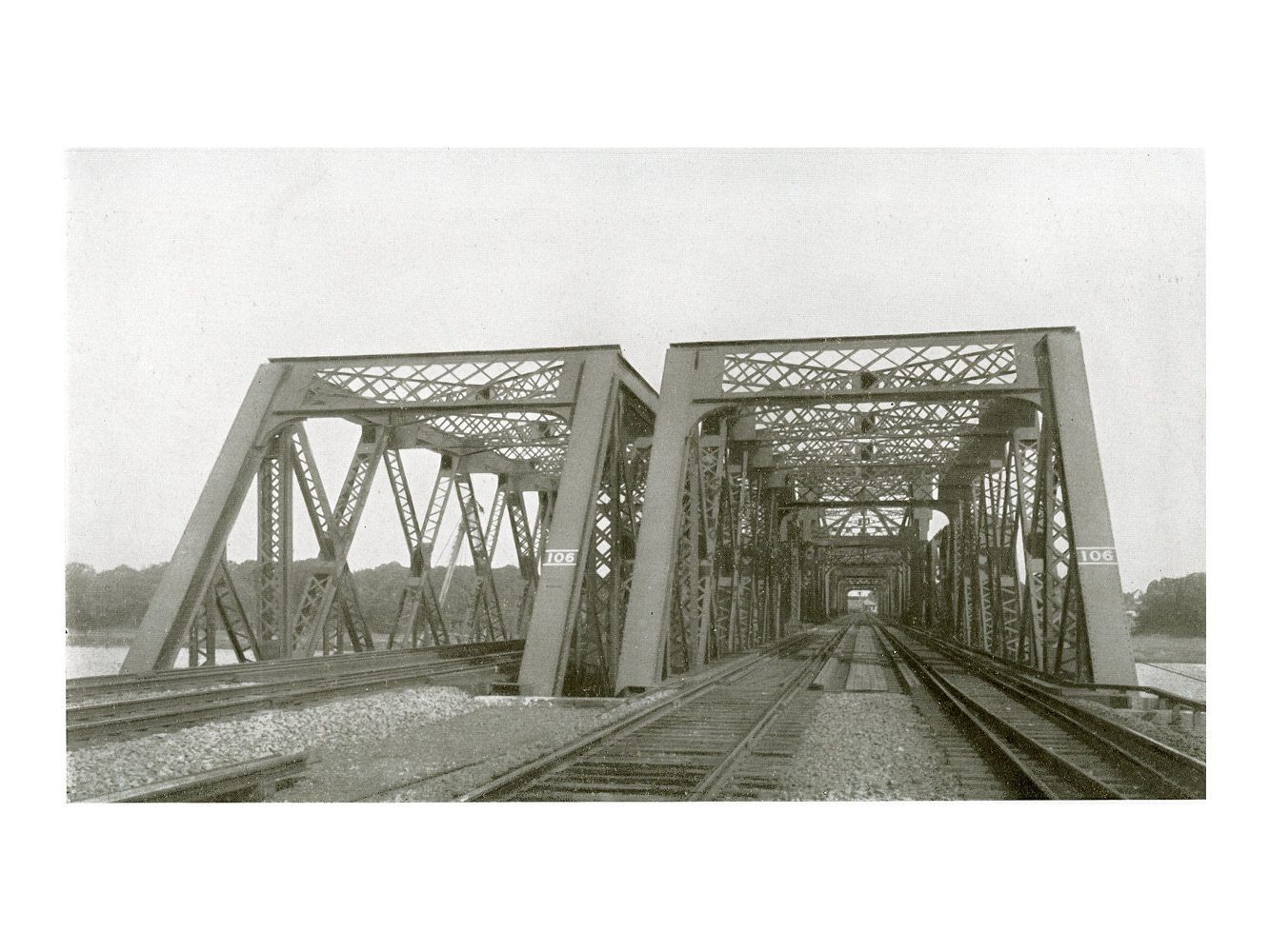 Consisting of two parallel double-track structures each made up as follows: one through riveted span, 145 ft 0-in c-c; three through pin-connected spans, each 217 ft 0-in c-c; one deck plate-girder span, 34 ft 8-in o-o; one Scherzer type of Bascule span, 108 ft 3-in; one deck plate-girder span, 108 ft 0-in o-o. Weight 7,829 tons.