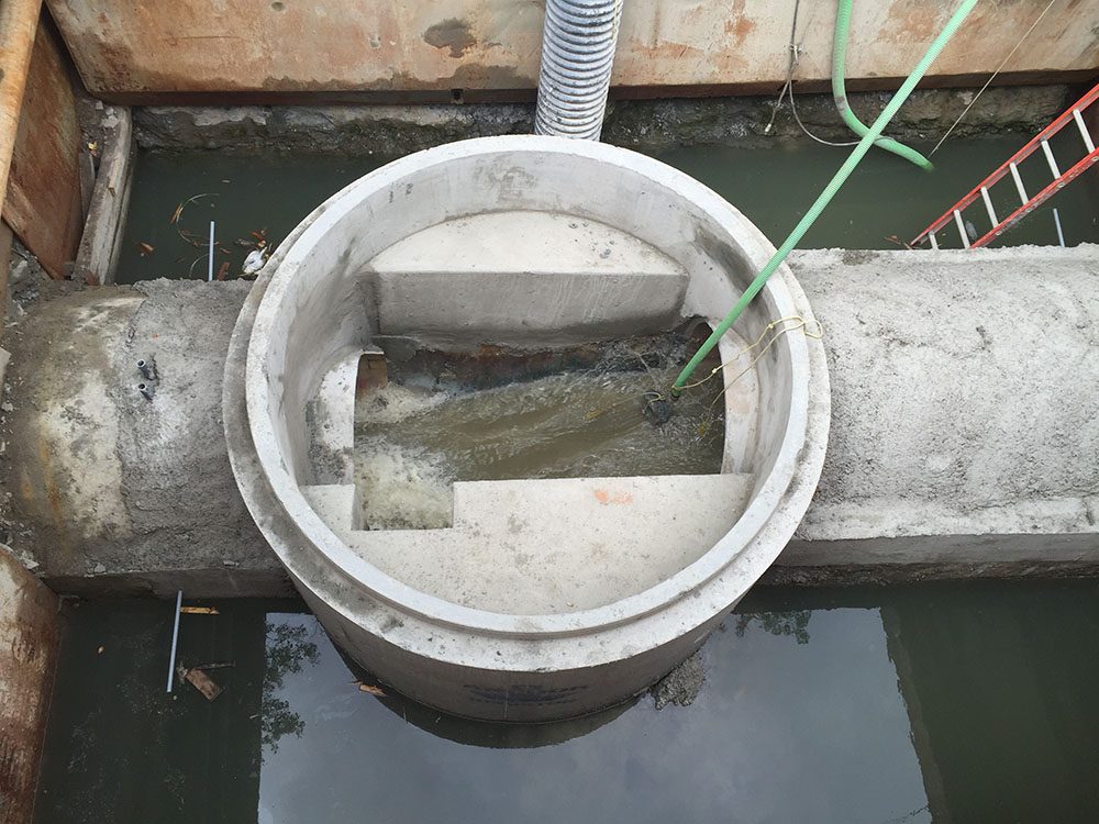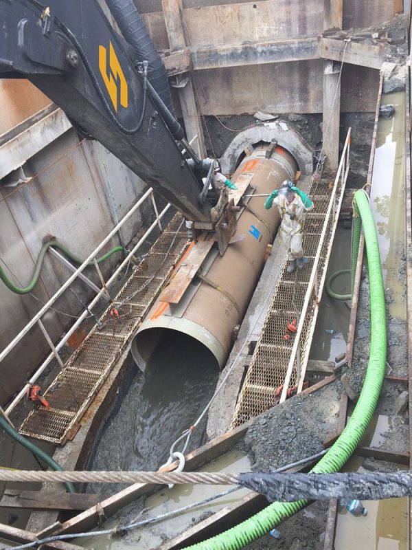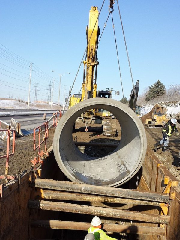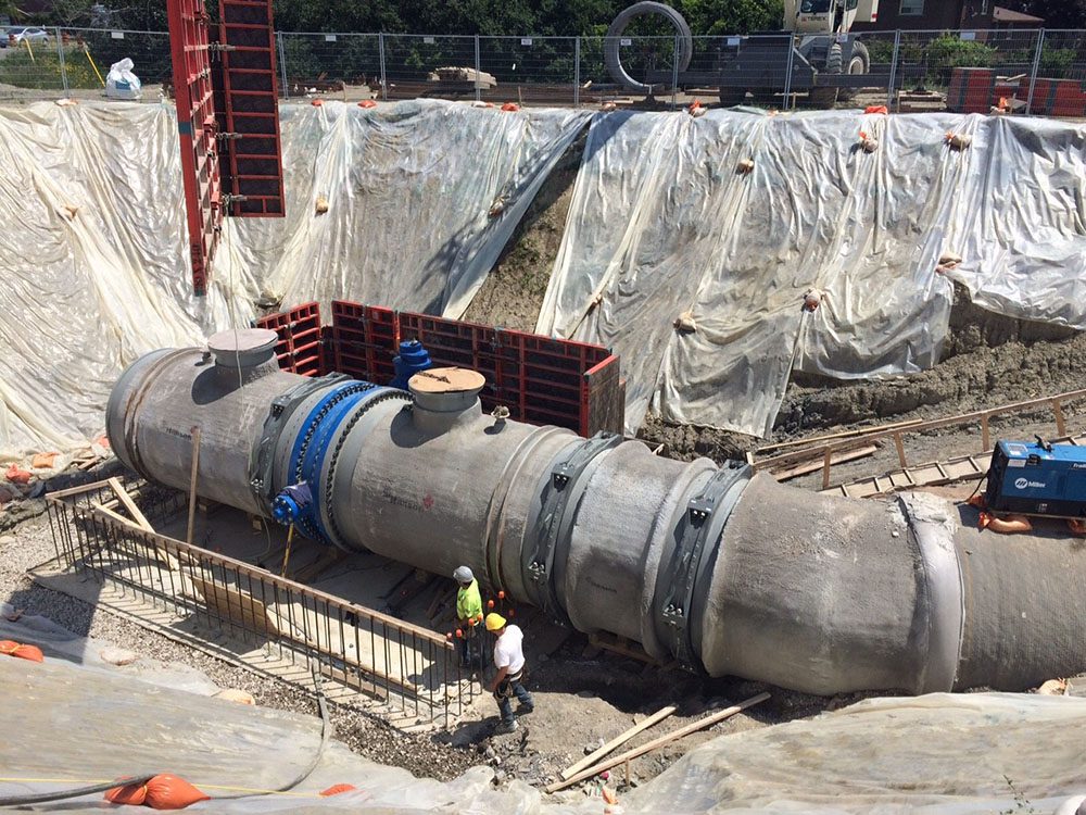 Completed in 2021 by Southland Contracting, the Humber Sanitary Trunk Sewer (STS) Rehabilitation Project consisted of the installation of approximately 7,972 linear feet section of 60-inch to 64-inch diameter Humber sanitary trunk sewer and a 220 linear feet section of 28-inch diameter Chapman sanitary trunk sewer using a Hobas glass-fiber reinforced plastic (GRP) pipe, the rehabilitation of associated maintenance holes using chemical grout to seal active infiltration, and the application of sprayed interior corrosion resistant coating. Confined space entries consisted of three existing manhole structures on the Humber STS project that required new cementitious structural liner and corrosion-resistant epoxy coating. Eight new manhole structures also required the application of corrosion-resistant epoxy coating. There were also seven existing wet tie-ins that had to be reinstated once the proposed FRP was installed (sliplined) through the host pipe. The project was completed exclusively in live flow conditions, often peaking at a velocity of over 9.8 feet per second. Over 7,875 linear feet of fiberglass reinforced pipe (FRP) liner was installed ranging in size from 54 inches to 57 inches. A 219-foot section of 27-inch FRP was installed through an existing 30-inch reinforced concrete lateral. This particular section had a much slower velocity, peaking at around 4.3 feet per second. There was a 43-foot section of 30-inch reinforced concrete pipe that required replacement. Due to the curve sliplining was not an option. This section was open cut and required a bypass system to control a flow rate of approximately 300 liters per second while the final connection was made between two of the new manhole structures. Asphalt and concrete paving was primarily for rehabilitation and included 4,527 square feet of full-depth structural section asphalt paving as well as 18,044 square feet of asphalt for a multi-use trail. Concrete was used to construct a 295 linear feet concrete barrier curb, 295 linear feet of standard curb and gutter, and a standard sidewalk of 131 linear feet.