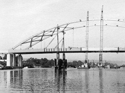 Completed in 1974 by American Bridge, the I-79 Neville Island Bridge project consisted of the fabrication and erection of a box chord tied arch bridge with a 125′ rise to the top of the arch.