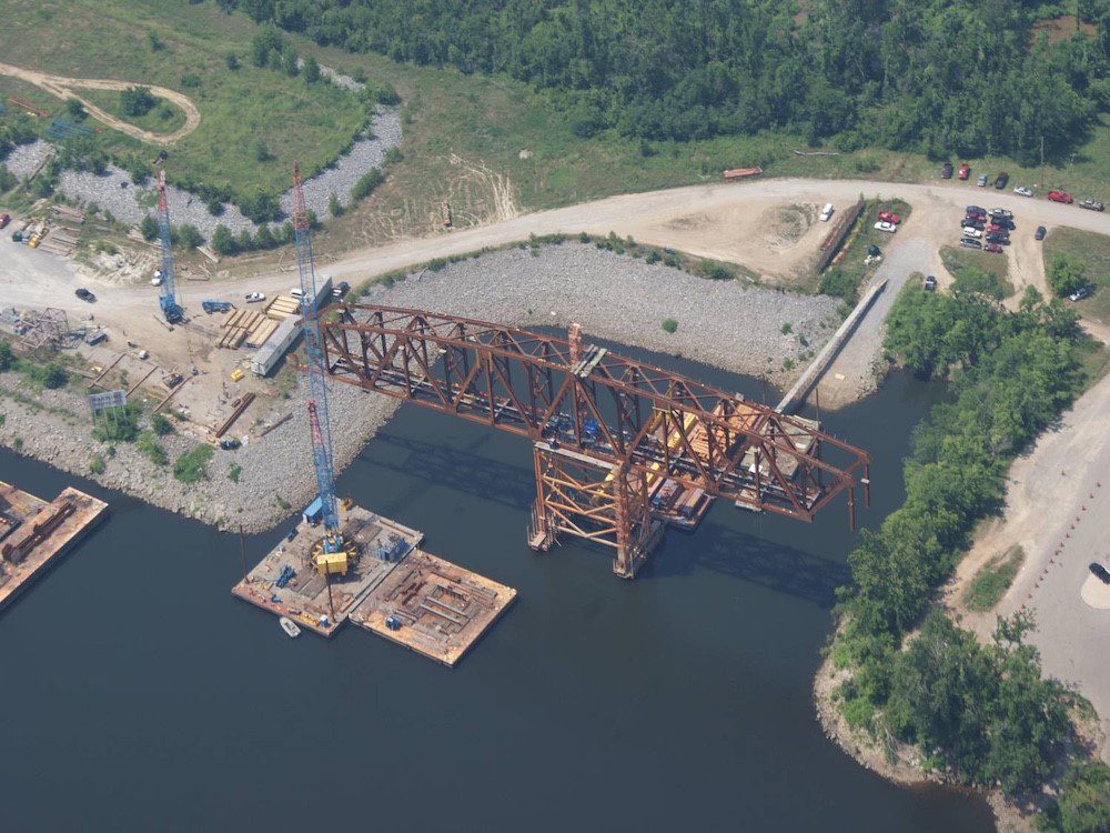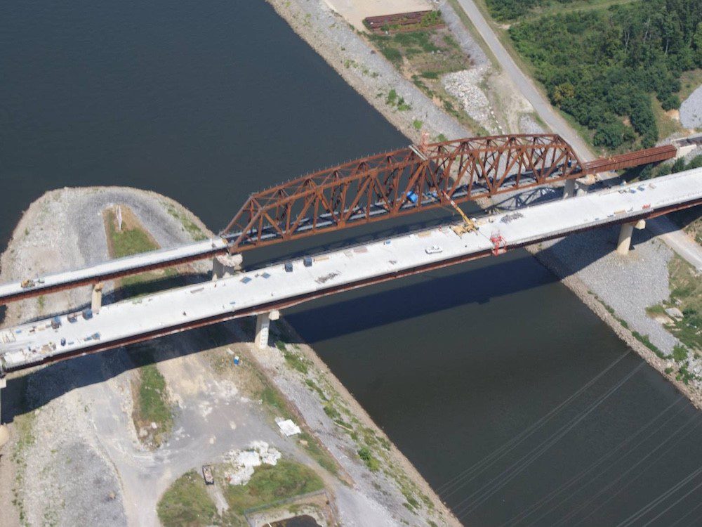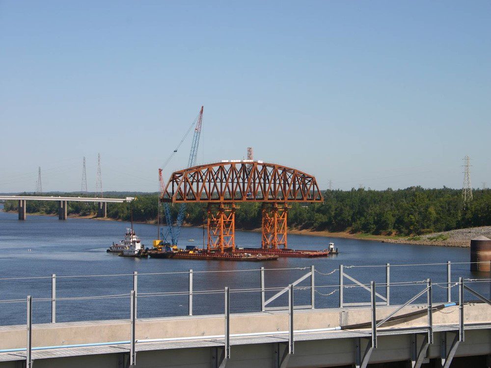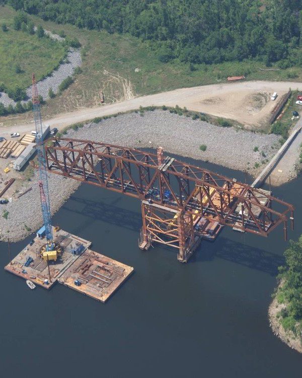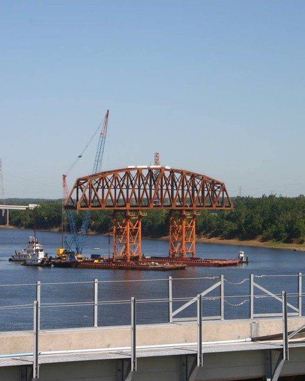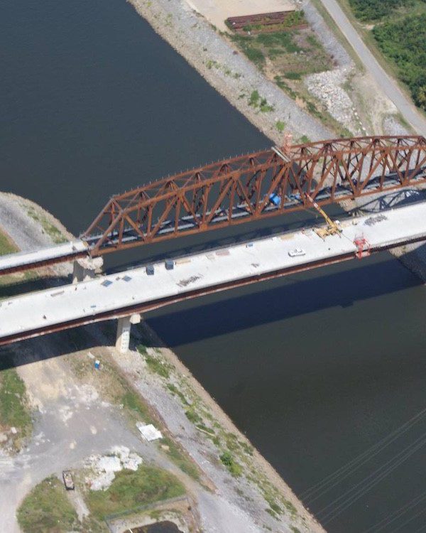 Completed in 2012 by American Bridge, this project included superstructure construction for two new bridges—a 3,116’ roadway bridge and a railroad bridge—to support the Kentucky Lock widening. The roadway bridge featured 10 steel plate girder spans, with a 505’ main span erected using the drop-in method. The 2,200-ton railroad truss span was assembled on falsework, floated into position, and lowered onto permanent bearings. A separate 120’ rail bridge was replaced within a 48-hour closure. American Bridge self-performed all steelwork and 10,000CY of concrete deck.