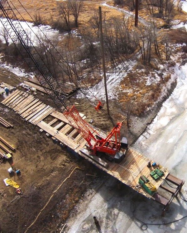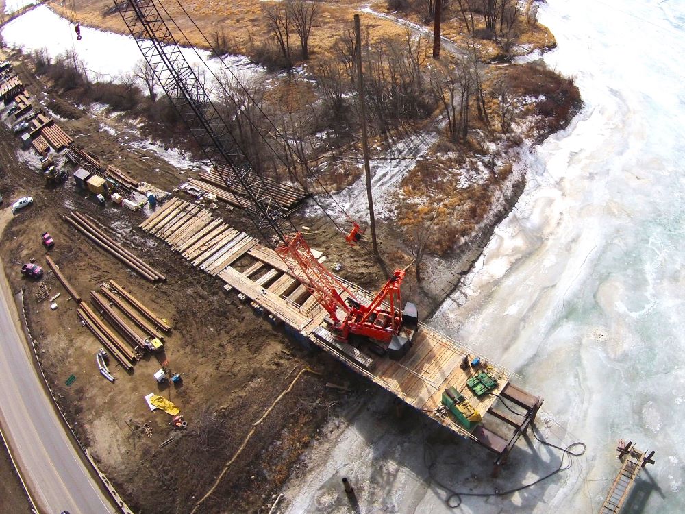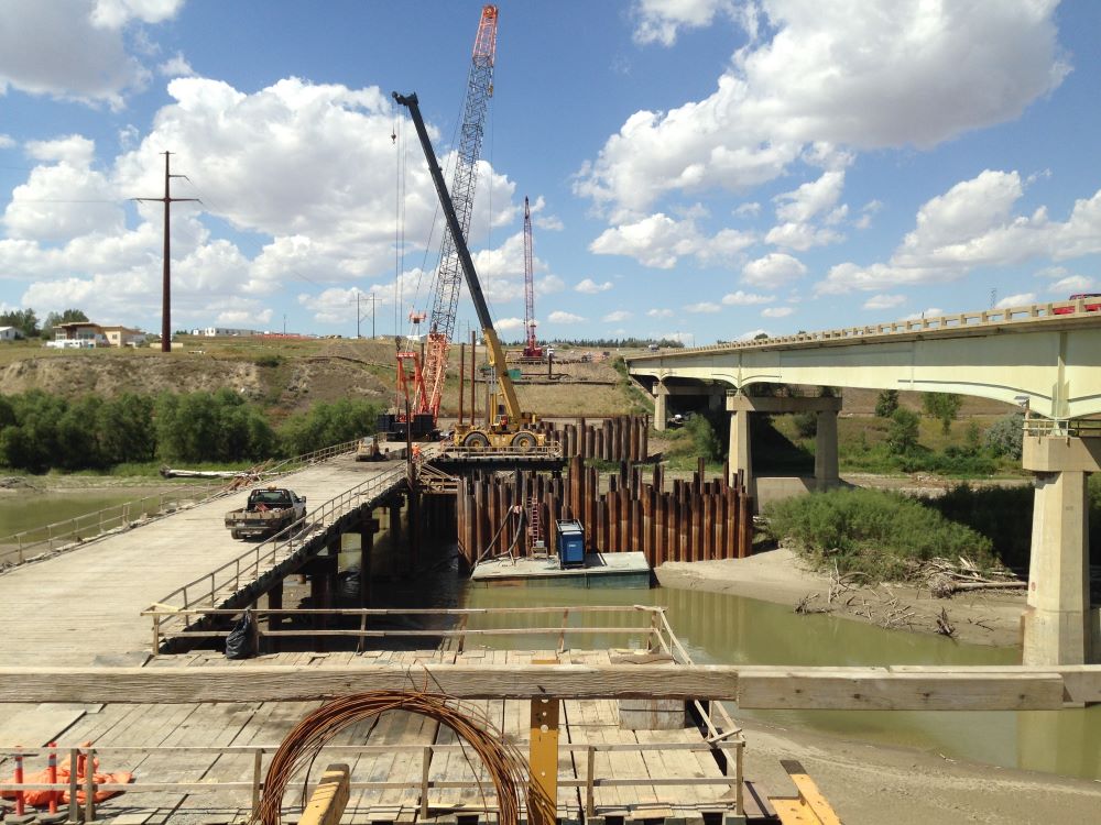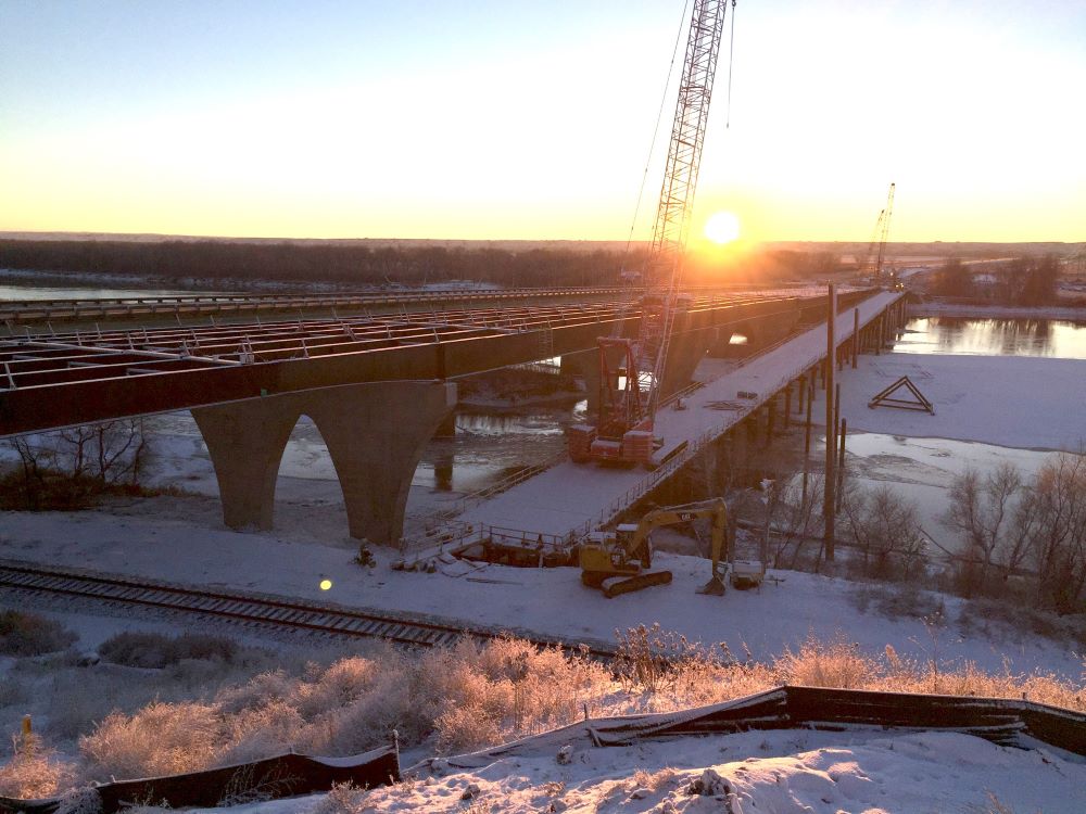 Completed in 2017, the Lewis & Clark Bridge; US 85 over Missouri River project consisted of the construction of a six-span, continuous deck unit, 1,522 foot long by nearly 85 feet wide, four lane, high-level bridge spanning the Missouri River. All the construction of the river crossing was performed from temporary trestle. The project also included a wildlife relief bridge, nearly five miles of associated roadway widening and removal of the existing bridge structure. Thirty-five (35) foot deep cofferdams were used to construct the bridge piers while protecting the endangered fish species in the river. One span of the bridge crosses the BNSF tracks so extensive coordination with the railroad was required.