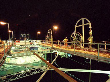 American Bridge was design/builder and general contractor for the reconstruction of this suspension bridge. Design subconsultants included Parsons Brinckerhoff, Klohn, Crippen Berger, Limited and Parsons Transportation Group. The bridge remained fully operational throughout construction, with work being undertaken during limited nighttime and certain weekend closures. The work included the removal of the entire 40′ (12.2m) wide by 2,778′ (847m) long stiffening through truss, replacement with a 53′ (16.2m) by 2,778′ (847m) deck truss with orthotropic deck, the new expansion dams, replacement of all 162 hangers, replacement of cable band bolts, the design/build seismic upgrade of north approach viaduct including ground improvement, pile supported spread footer encasement, steel bent strengthening, new deck girder diaphragms, restrainer installation and abutment bearing replacement; and the upgrade and widening of the 1.25 (2km) mile Stanley Park Causeway, including new utility installation, retaining wall construction, new sidewalk/bike path construction and roadway resurfacing. The work also included the addition of three new maintenance travelers, each 9′ by 62′ by 4′ (2.8m by 18.8m by 1.145m) tall. Each traveler is powered by a diesel generator and electric motors and contains a scissor lift.