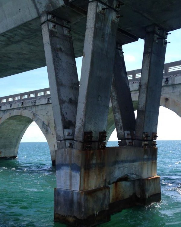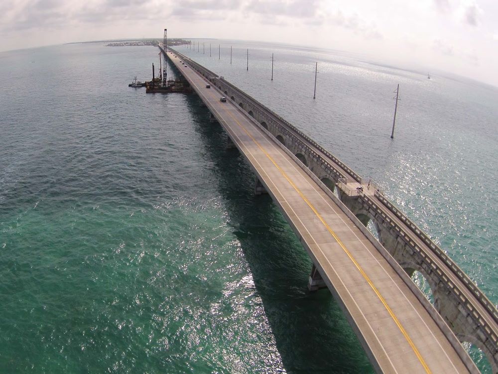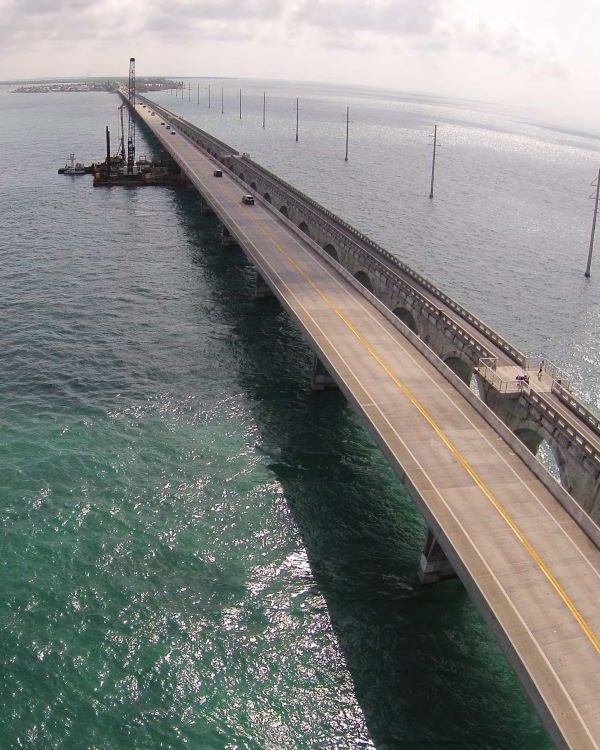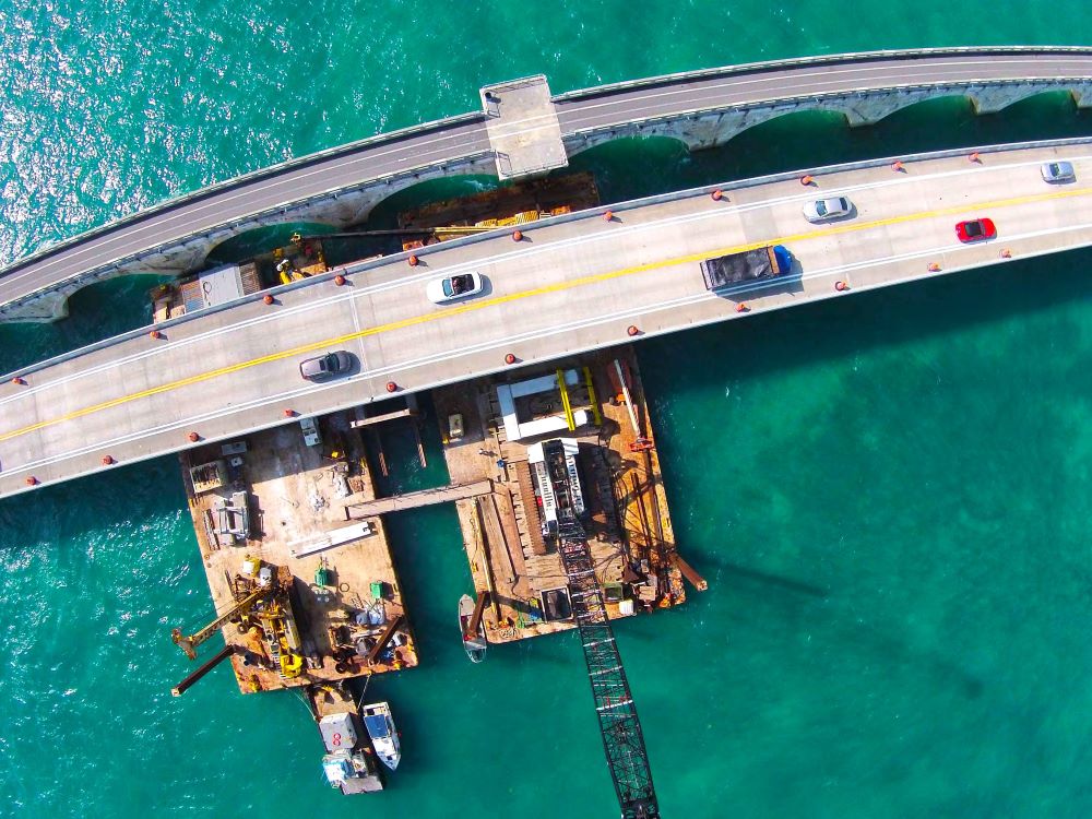 Completed in 2016, the Long Key Bridge – V Piers Replacement project consisted of the replacement of severely deteriorated V-piers at the 12 expansion joints at the Long Key Bridge in the Florida Keys. This bridge is 2.3 miles long, which is the 2nd longest bridge in the Florida Keys and the only evacuation route of the Lower Keys during hurricane season. This project required installation of temporary drilled shafts, installation of a unique temporary support system which stabilized the existing V-piers prior to removal. The existing 12 V-piers were removed by saw cutting and new precast piers were installed using a self-engineered support frame system. The bridge was raised and lowered by hydraulic jacks to allow new piers to be installed all while making sure no material fell in the water. This project was constructed utilizing an innovative construction approach while maintaining uninterrupted live traffic and meeting the most stringent environmental requirements. This project had tight working conditions and was a total marine project constructed off barges.