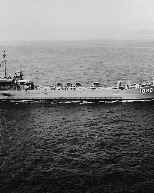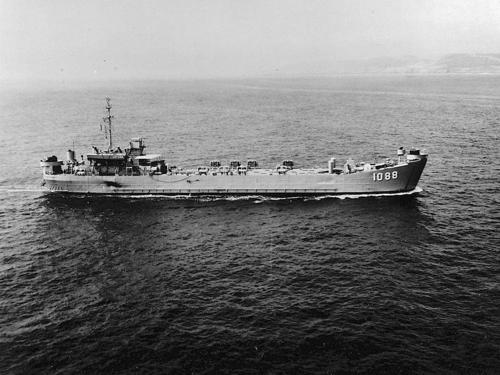 Built by American Bridge Company at the Ambridge Manufacturing Plant in Ambridge, PA. Launched February 11, 1945. Commissioned USS LST-1088 on March 27, 1945. During World War II, USS LST-1088 was assigned to the Asiatic-Pacific Theater. Following World War II USS LST-1088 was assigned to Occupation service in the Far East from 25 October 1945 to 1 January 1946. Decommissioned on August 29, 1946 at Portland, OR. Laid up in the Pacific Reserve Fleet, Columbia River Group, Astoria, OR. Named USS Pulaski County (LST-1088), July 1, 1955. Moved to Pacific Reserve Fleet, Bremerton Group, 1961. Recommissioned on May 21, 1963. During the Vietnam War USS Pulaski County participated in the following campaigns: Vietnamese Counteroffensive (April 9 to 14, 1966; May 1 to 10, 1966; and June 5 to 9, 19 to 24, 1966) and Vietnamese Counteroffensive – Phase II (July 1 to 3, 12 to 15, 1966; August 1 to 5, 13 to 20, 1966; September 4 to 7, 21 to 24, 1966; October 4 to 12, 22 to 27, 1966; December 20 to 30, 1966; and January 6 to March 23, 1967). Decommissioned and placed in-service by MSTS in April 30 1967. Transferred in July 1967 to MSTS and placed in service wtih a Korean civilian crew as USNS Pulaski County (T-LST-1088). Placed out-of-service, date unknown. Struck From the Naval Register, November 1, 1973. USS Pulaski County earned two campaign stars for Vietnam War service. Final Disposition, sold for scrapping, January 1, 1975, by DRMS (Defense Reutilization and Marketing Service).