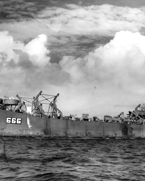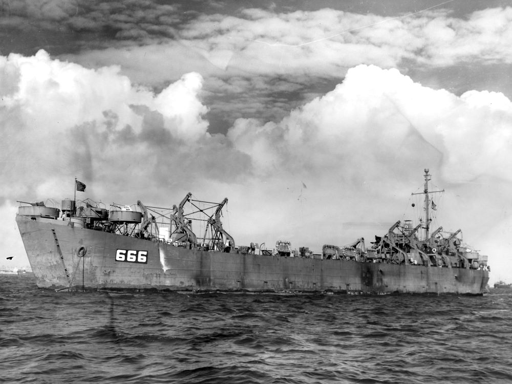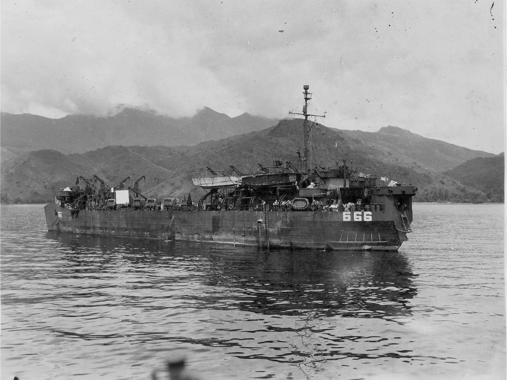 Built by American Bridge Company at the Ambridge Manufacturing Plant in Ambridge, PA. Launched April 24, 1944. Commissioned USS LST-666 on May 16, 1944. During World War II USS LST-666 was assigned to the Asiatic-Pacific Theater. Participated in six campaigns including Western New Guinea operation (Morotai landings, September 15, 1944), Leyte operations (Leyte landings – Tacloban, October 16 to 30 and November 9 to 29, 1944), Luzon operation (Lingayen Gulf landings, January 4 to 18, 1945), Manila Bay-Bicol operation (Zambales-Subic Bay, January 29 to 30, 1945), Consolidation and capture of the Southern Philippines (Palawan Island landings, Puerto Princessa, March 1 to 2, 1945. Visayan Island landings, Iloilo, Panay Island and Pulupandan, Negros Island, March 18 and March 29 to April 1, 1945), and Borneo operation (Balikpapan operation, June 26 to July 9, 1945). USS LST-666 earned six battle stars for World War II service. Following World War II USS LST-666 was assigned to Occupation service in the Far East for the following periods: September 28 to December 12, 1945 and December 20, 1945 to January 5, 1946. Decommissioned on June 20, 1946. A total of 314 officers and men served aboard USS LST-666 during the ship’s 25 months of commissioned service. Struck from the Naval Register on July 31, 1946. Final Disposition, sold on September 26, 1947, to Sun Shipbuilding and Dry Dock Co., Chester, PA. for scrapping.