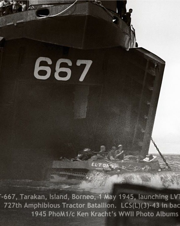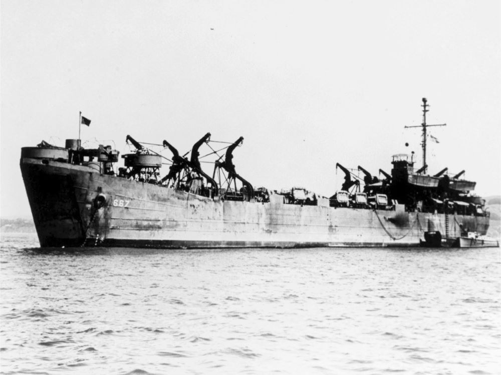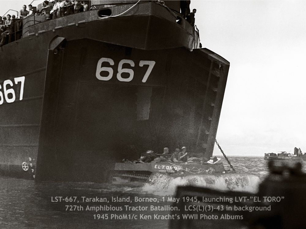 Built by American Bridge Company at the Ambridge Manufacturing Plant in Ambridge, PA. Launched April 27, 1944. Commissioned USS LST-667 on May 20, 1944. During World War II USS LST-667 was assigned to the Asiatic-Pacific Theater. Participated in five campaigns including Western New Guinea operation (Morotai landings, September 15, 1944), Leyte operations (Leyte landings – Tacloban, October 16 to 30 and November 9 to 29, 1944), Luzon operation (Lingayen Gulf landings, January 4 to 18, 1945), Consolidation and capture of the Southern Philippines (Visayan Island landings, Iloilo, Panay Island and Pulupandan, Negros Island, March 29 to April 1, 1945), and Borneo operation (Tarakan Island operation, April 30 to May 3, 1945). USS LST-667 earned five battle stars for World War II service. Following World War II USS LST-667 was assigned to Occupation service in the Far East for the following periods: September 15 to October 20, 1945; November 12 to 25, 1945; December 23, 1945 to January 8, 1946; and January 20 to February 26, 1946. Decommissioned on June 5, 1946. Struck from the Naval Register on July 3, 1946. Final Disposition, sold on December 11, 1947, to Learner Co., Oakland, CA. for scrapping.