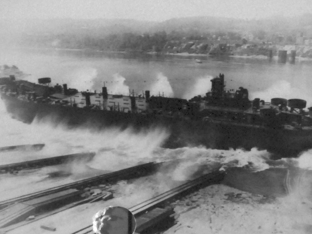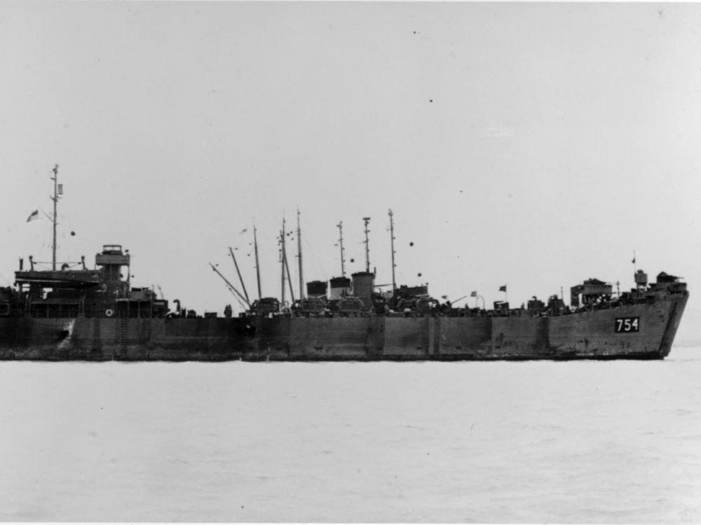 Built by American Bridge Company at the Ambridge Manufacturing Plant in Ambridge, PA. Launched July 6, 1944. Commissioned USS LST-754 on July 29, 1944. During World War II, USS LST-754 was assigned to the Asiatic-Pacific Theater. Participated in three campaigns including Luzon operation (Lingayen Gulf landings, January 8 to 18, 1945), Manila Bay-Bicol operation (Mariveles-Corregidor, February 14 to 28, 1945) and Consolidation and capture of the Southern Philippines (Mindanao Island landings, April 17 to 23, 1945). USS LST-754 earned three battle stars for World War II service. Following World War II USS LST-754 was assigned to Occupation and China service in the Far East for the following periods: September 2 to 8 1945 to May 27, 1946. Decommissioned on June 20, 1946. Struck from the Naval Register on July 31, 1946. Final Disposition, sold for scrapping on May 21, 1948, to Bethlehem Steel Co., Bethlehem, PA.
