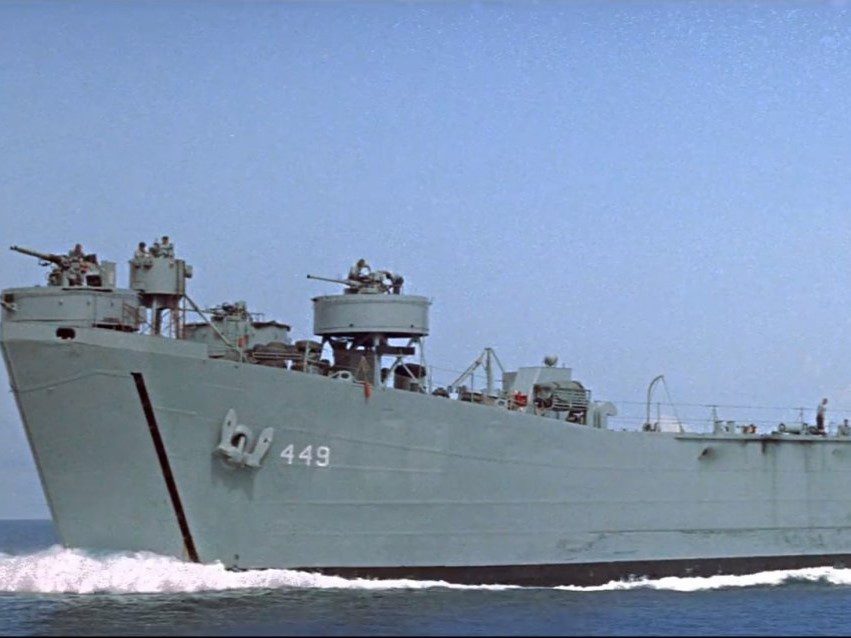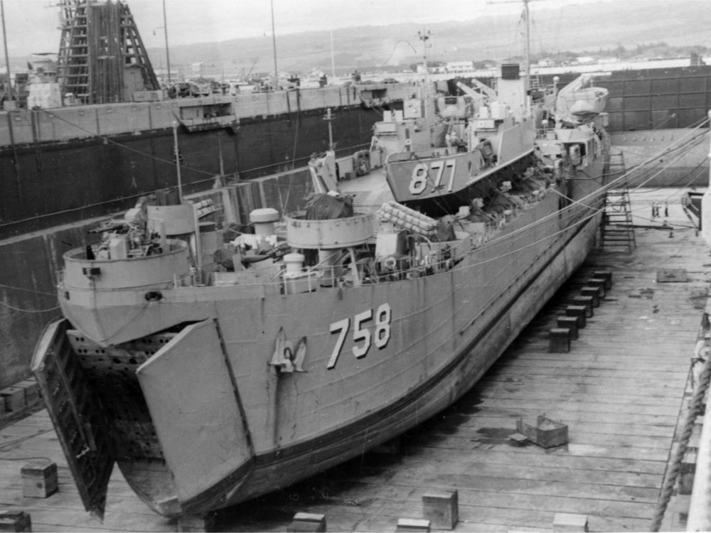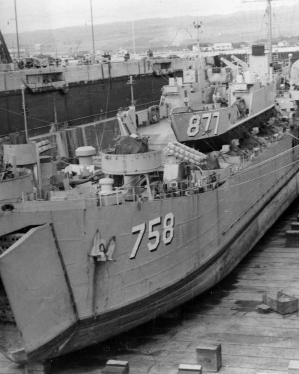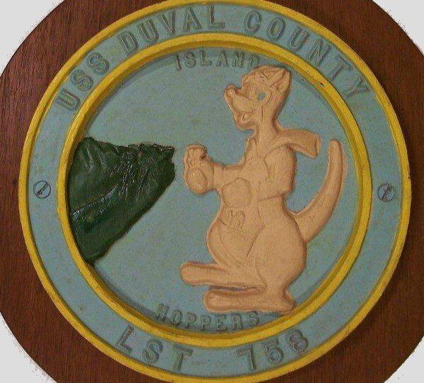 Built by American Bridge Company at the Ambridge Manufacturing Plant in Ambridge, PA. Launched July 25, 1944. Commissioned USS LST-758 on August 19, 1944. During World War II, USS LST-758 was assigned to the Asiatic-Pacific Theater. Participated in three campaigns including Iwo Jima operation (Assault and occupation of Iwo Jima, February 19 to 26, 1945), Okinawa Gunto operation (Assault and occupation of Okinawa Gunto, April 2 to May 30, 1945), and Minesweeping operations Pacific (Fukuoka (Kyushu-Korea Area), November 28 to December 14, 1945). USS Duval County earned three battle stars for World War II service and four battle stars for Korean service as USS LST-758. Following World War II USS LST-758 was assigned to Occupation and China service in the Far East for the following periods: September 20 to 25, 1945 and February 15 to 17, 1953. Decommissioned on July 13, 1946 and laid up in the Reserve Fleet. Recommissioned on November 3, 1950 with a US Navy crew. During the Korean War USS LST-758 participated in the following campaigns: UN Summer-Fall Offensive (July 12 to September 2, 1951 and October 29 to November 23, 1951); Korean Defense Summer-Fall 1952 (November 14 to 20, 1952); Third Korean Winter (December 10 to 18 and 22 to 23, 1952; January 3 to 31, 1953; March 14 to 30, 1953; and 12 April 7 to 12 1953); Korean Summer-Fall 1953 (July 7 to 8, 13, and 24 to 27, 1953). Named Duval County (LST-758) on July 1, 1955. Decommissioned on October 13, 1969. Custody transfer to the Maritime Administration (MARAD) for lay up in the National Defense Reserve Fleet, James River, Lee Hall, VA. Struck from the Naval Register on November 1, 1976. Final Disposition, sold for scrapping by MARAD on August 18, 1981, to North American Smelting Co., for $81,111,11.