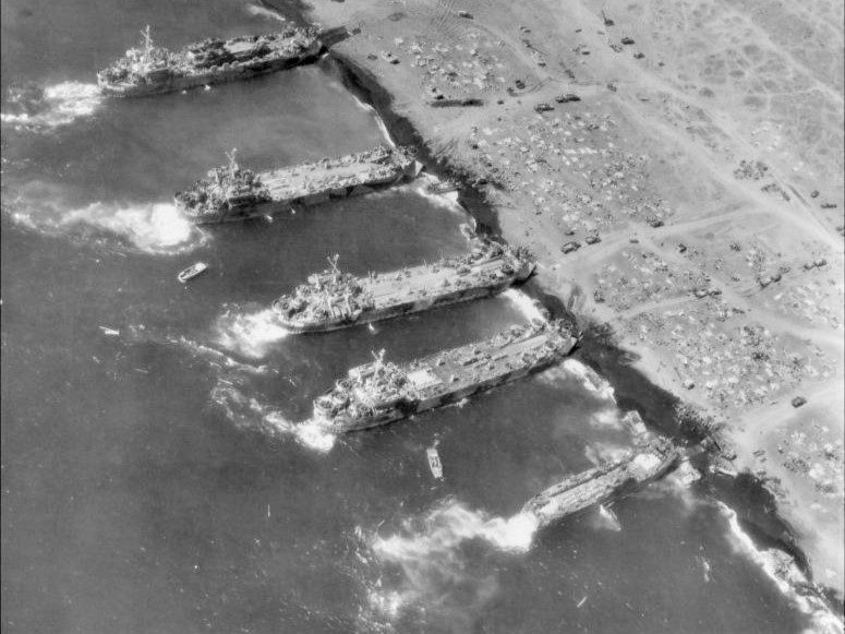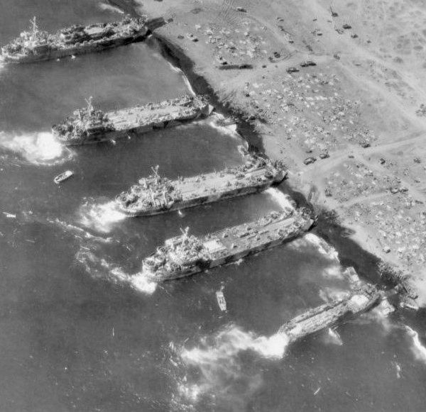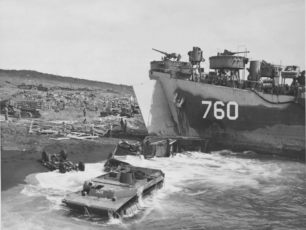 Built by American Bridge Company at the Ambridge Manufacturing Plant in Ambridge, PA. Launched August 3, 1944. Commissioned USS LST-760 on August 28, 1944. During World War II, USS LST-760 was assigned to the Asiatic-Pacific Theater. Participated in two campaigns including Iwo Jima operation (Assault and occupation of Iwo Jima, February 19 to 26, 1945) and the Okinawa Gunto operation (Assault and occupation of Okinawa Gunto, April 1 to June 10, 1945). USS LST-760 earned two battle stars for World War II service. Following World War II USS LST-760 was assigned to Occupation service in the Far East for the following periods: September 9 to 25, 1945; October 12 to November 1, 1945; and November 18 to December 8, 1945. Decommissioned on May 24, 1946. Struck from the Naval Register on July 3, 1956. Final disposition, sold for scrapping on May 29, 1948, to Bethlehem Steel Co., Bethlehem, PA