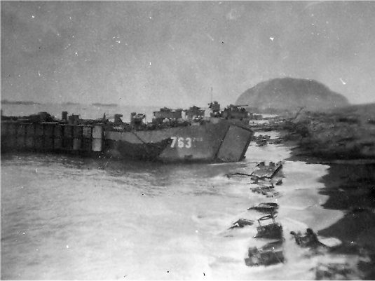 Built by American Bridge Company at the Ambridge Manufacturing Plant in Ambridge, PA. Launched August 16, 1944. Commissioned USS LST-763 on September 8, 1944. During World War II, USS LST-763 was assigned to the Asiatic-Pacific Theater. Participated in two campaigns including the Iwo Jima operation (Assault and occupation of Iwo Jima, February 19 to March 3, 1945) and Okinawa Gunto operation (Assault and occupation of Okinawa Gunto, April 26 to June 10, 1945). USS LST-763 earned two battle stars for World War II service. Following World War II USS LST-763 was assigned to Occupation service in the Far East for from September 10 to November 13, 1945. Decommissioned on April 29, 1946. Struck from the Naval Register on August 15, 1946. Final Disposition, sold for scrapping on December 11, 1947, to Southern Shipwrecking Co., New Orleans, LA.
