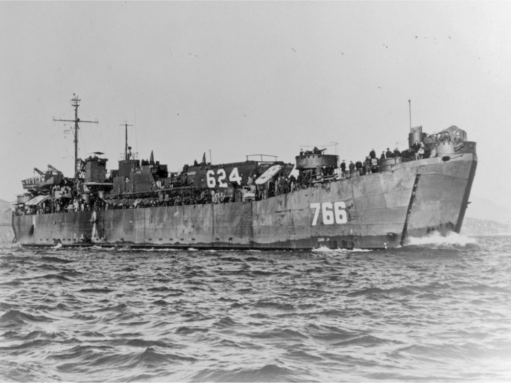 Built by American Bridge Company at the Ambridge Manufacturing Plant in Ambridge, PA. Launched August 30, 1944. Commissioned USS LST-766 on September 25, 1944. During World War II, USS LST-766 was assigned to the Asiatic-Pacific Theater. Following World War II USS LST-766 was assigned to Occupation and China service in the Far East for the following periods: Sepember 25 to October 18, 1945. Decommissioned on March 19, 1946. Struck from the Naval Register on June 5, 1946. Sold for commercial operations on December 24, 1946, to Pedro Bidegaray. Final Disposition, fate unknown.