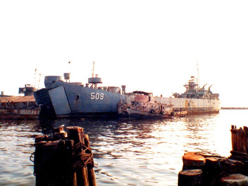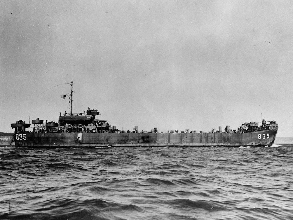 Built by American Bridge Company at the Ambridge Manufacturing Plant in Ambridge, PA. Launched October 25, 1944. Commissioned USS LST-835 on November 20, 1944. During World War II, USS LST-835 was assigned to the Asiatic-Pacific Theater. Participated in the Okinawa Gunto operation (Assault and occupation of Okinawa Gunto, May 1 to June 30, 1945). USS LST-835 earned one battle star for World War II service. Following World War II USS LST-835 was assigned to Occupation service in the Far East from October 29 to November 9, 1945. Decommissioned in June 1946, at Astoria, OR. Laid up in the Pacific Reserve Fleet, Columbia River Group. Named, Hillsdale County (LST-835), July 1, 1955. Struck from the Naval Register in October 1959. Sold to Japan in April 1961, renamed JNS Shimokita (LST-4002). Resold to the Republic of the Philippines, date unknown, renamed BRP Cavite (LT-509). Final Disposition, scrapped in 1989.